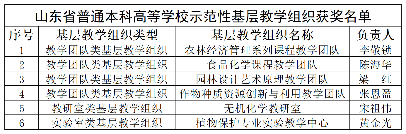 近日,山东省教育厅公布了首批省级示范性基层教学组织名单,青岛农业大学申报的6个基层教学组织全部入选,申报获批率100%。
