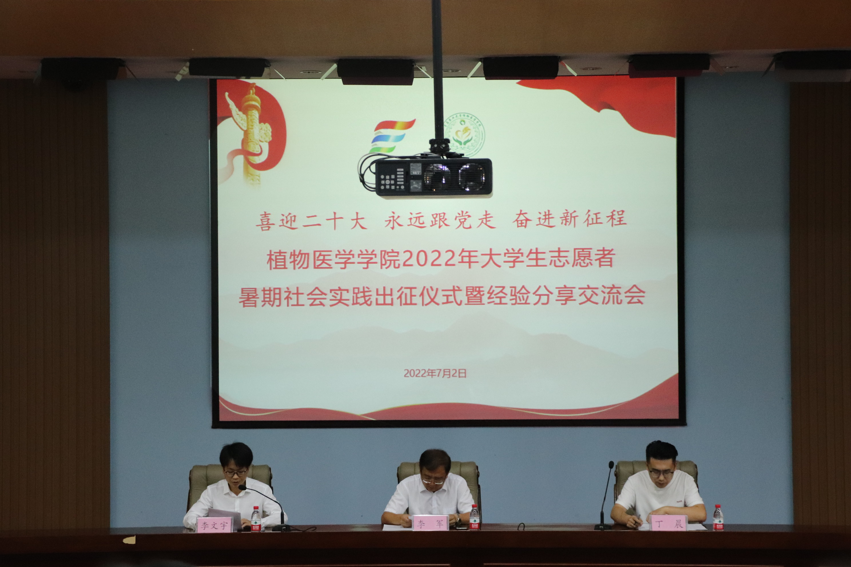 7月2日,青岛农业大学植物医学学院2022年大学生志愿者暑期文化科技卫生“三下乡”社会实践出征仪式暨拜耳科学安全使用农药大使项目颁奖仪式在学术会馆第三报告厅举行。学院党总支副书记、副院长李军出席并为获奖同学颁奖并致辞,辅导员丁晨以及学生会成员、学生代表参加本次仪式,仪式由学院学生会执行主席李文宇主持。