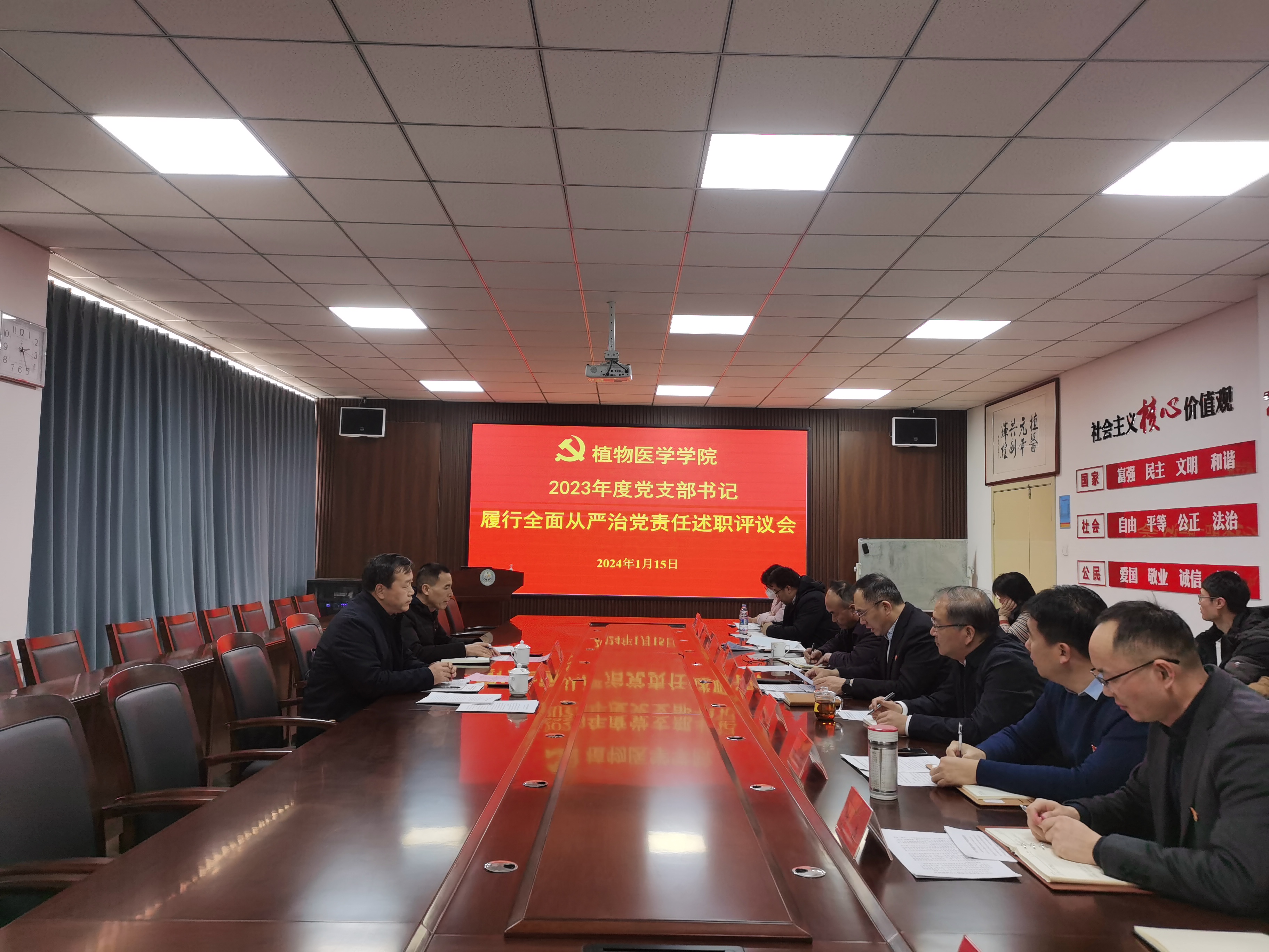 1月15日,植物医学学院党委在生物楼N406会议室召开2023年度党支部书记履行全面从严治党责任和抓基层党建工作述职评议会议。校党委书记郭善利出席会议并讲话,学校党政办公室副主任周立军、学院党委班子成员、专职组织员、各党支部书记、支部委员参加会议。会议由学院党委书记韩强主持。