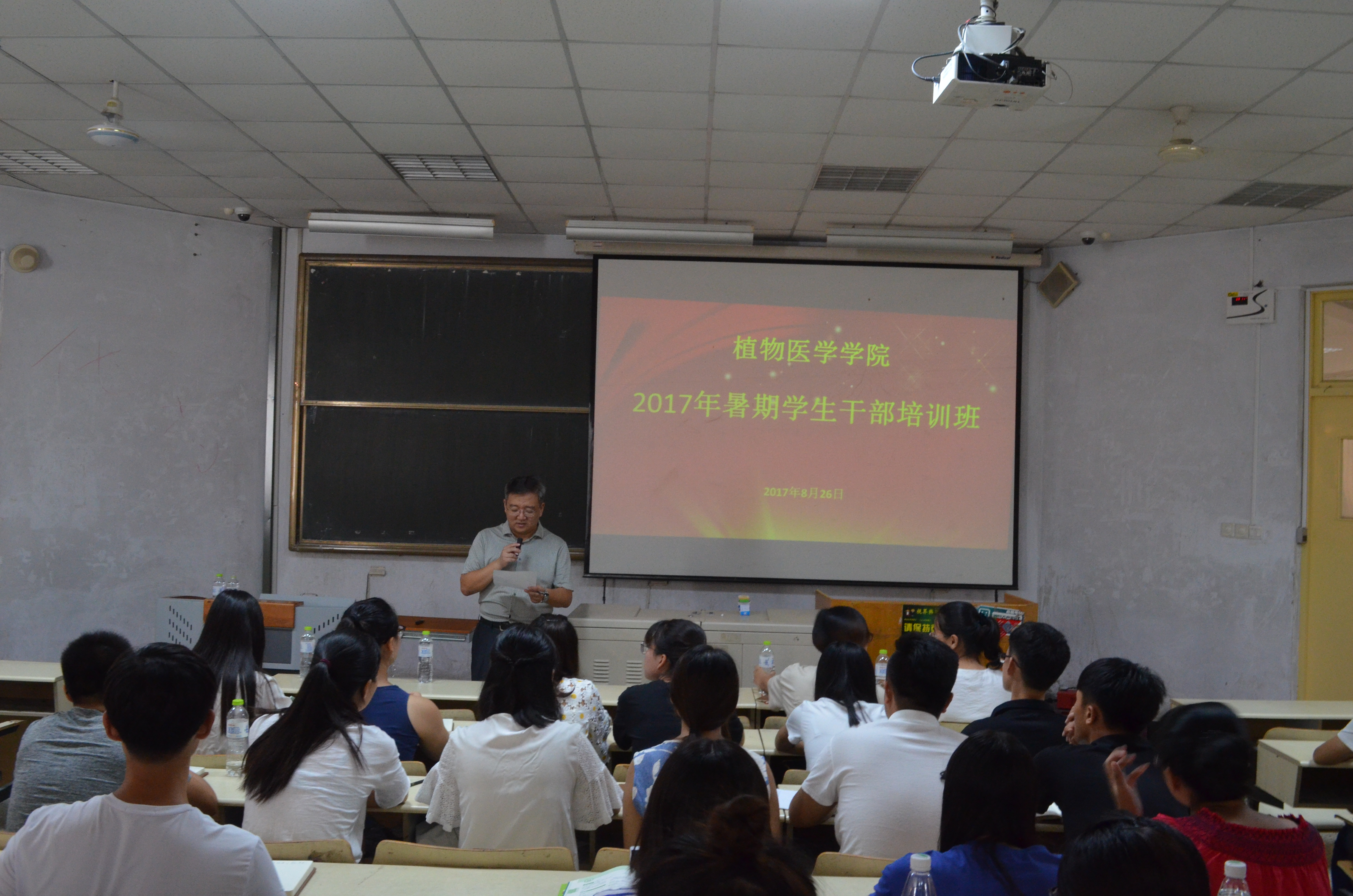 8月26日,植物医学学院在教学区B区开展了为期一天的2017年暑期学生干部培训学习。青岛瀚生谷成金公司总经理赵红波先生受邀出席会议,植物医学学院党总支副书记、副院长李军,学院团委书记马伟萍,辅导员王丽静及2015、2016级全体学生干部参加。