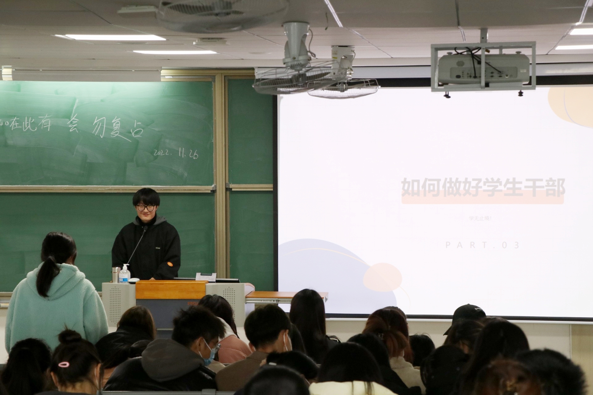 孙子恒结合自身经历分别讲述了大一和大二的课程规律,分享了不同阶段学习的经验方法,建议同学们多注重平时的积累,为以后专业课学习打好基础。他鼓励同学们在大学四年大胆尝试,提早规划大学生活,找到适合自己的道路。范林鑫结合自身担任学生干部经历,详细介绍了学院学生组织的架构,鼓励同学们积极投身学生工作,把学生工作当作课余生活的一部分,提升自身能力,增强本领。