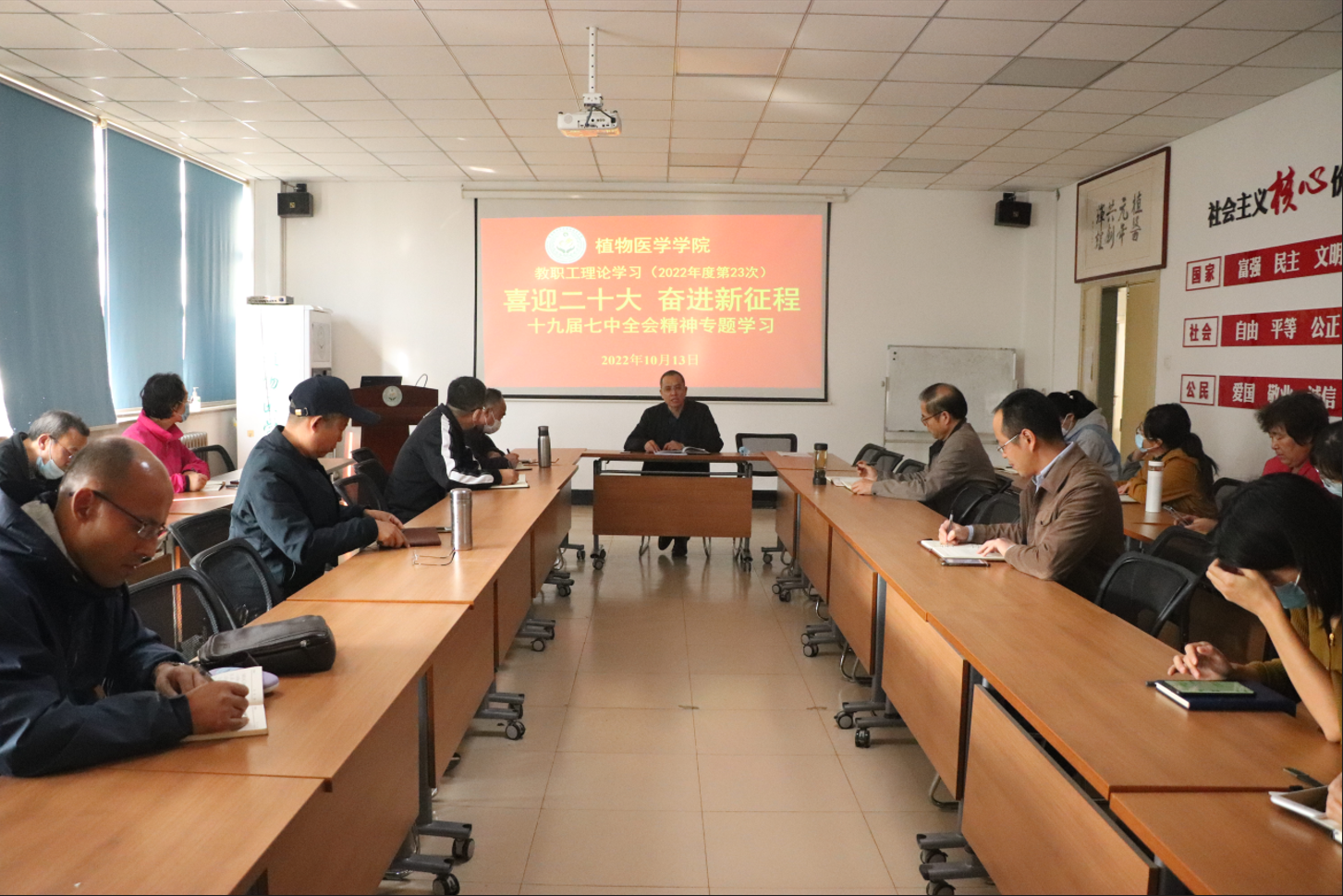 10月13日,青岛农业大学植物医学学院全体教职工在学院会议室开展2022年度第23次学习。会议由学院党委书记韩强主持,全体教职工参加。