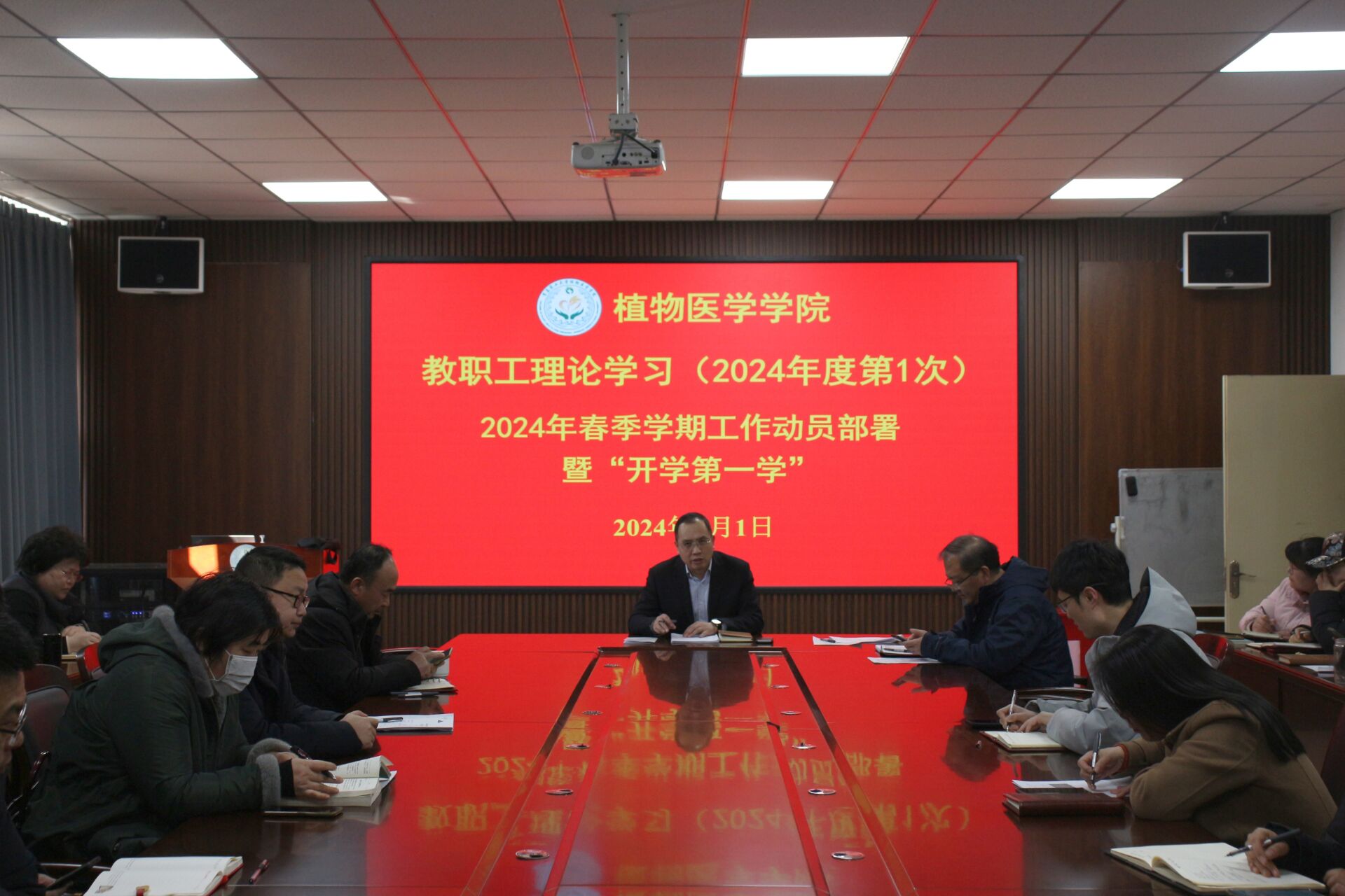 3月1日,青岛农业大学植物医学学院在学院会议室开展2024年春季学期教职工理论学习“开学第一学”,对2024年新学期工作进行安排部署和思想工作动员。会议由学院党委书记韩强主持,全体教职工参加。