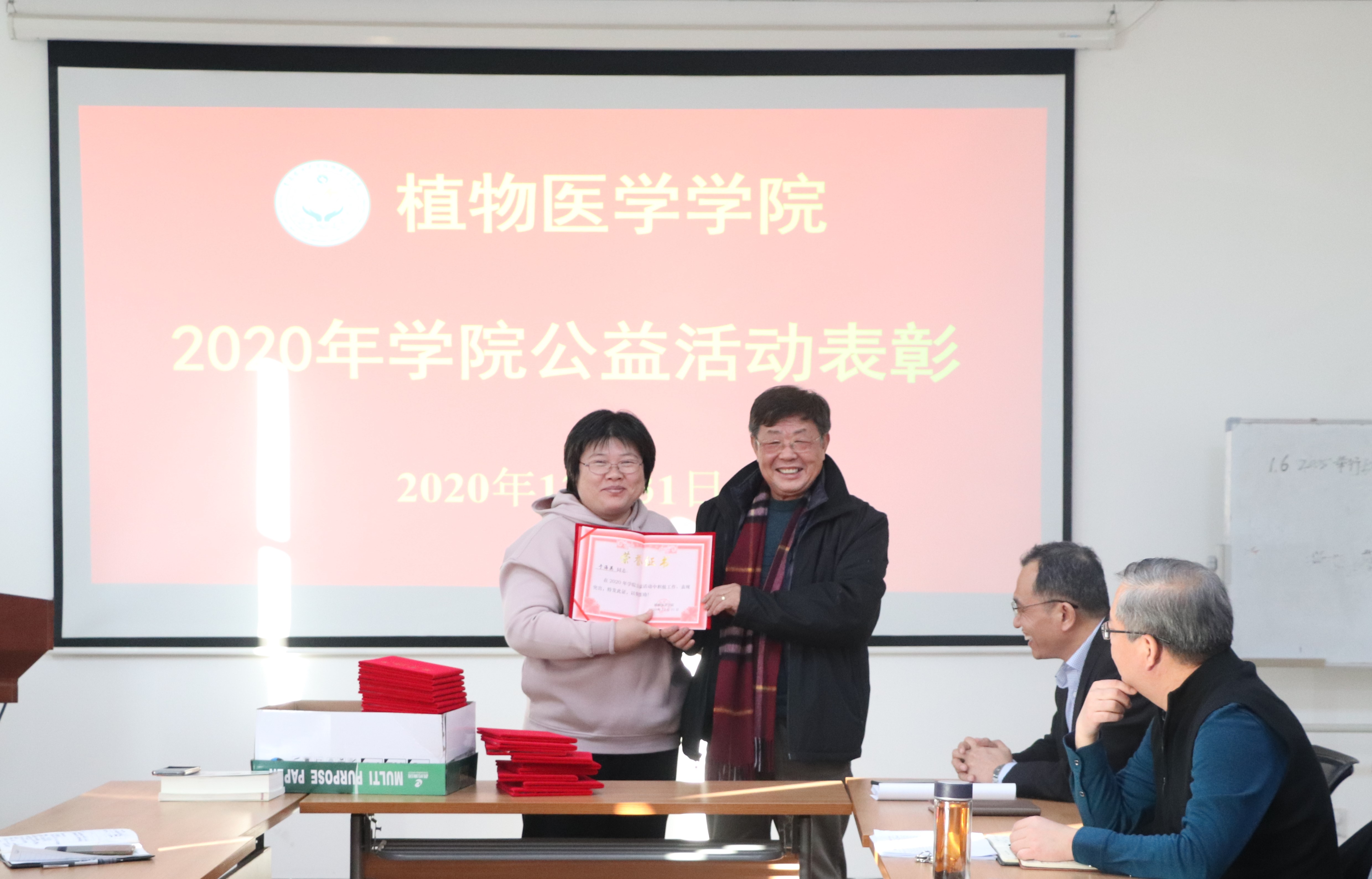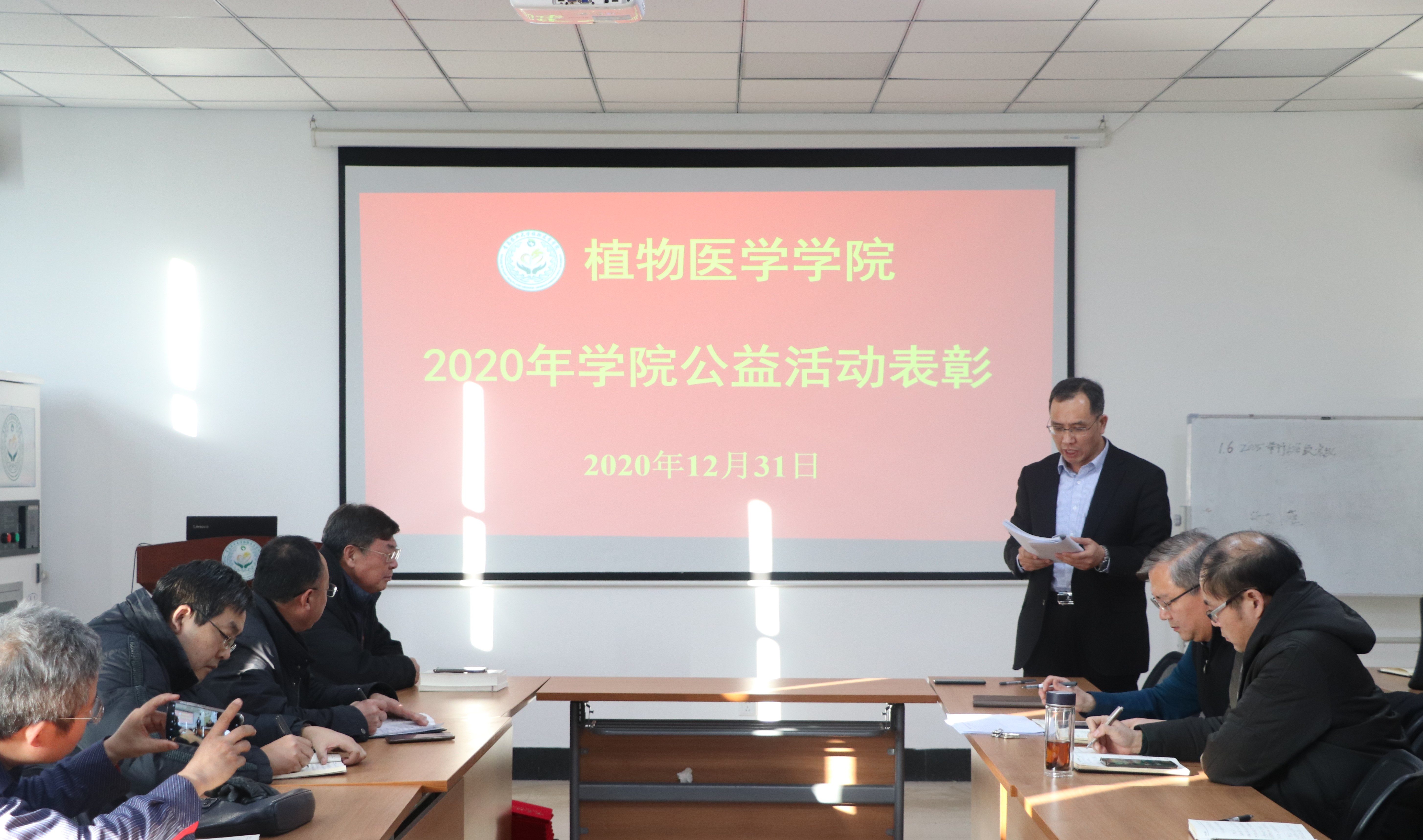12月31日,青岛农业大学植物医学学院于学院会议室举办2020年学院公益活动表彰大会,学院院长刘同先,党总支书记韩强,党总支副书记、副院长李军,副院长梁文星,黄金光,赵洪海,褚栋出席仪式,学院全体教职工参加。