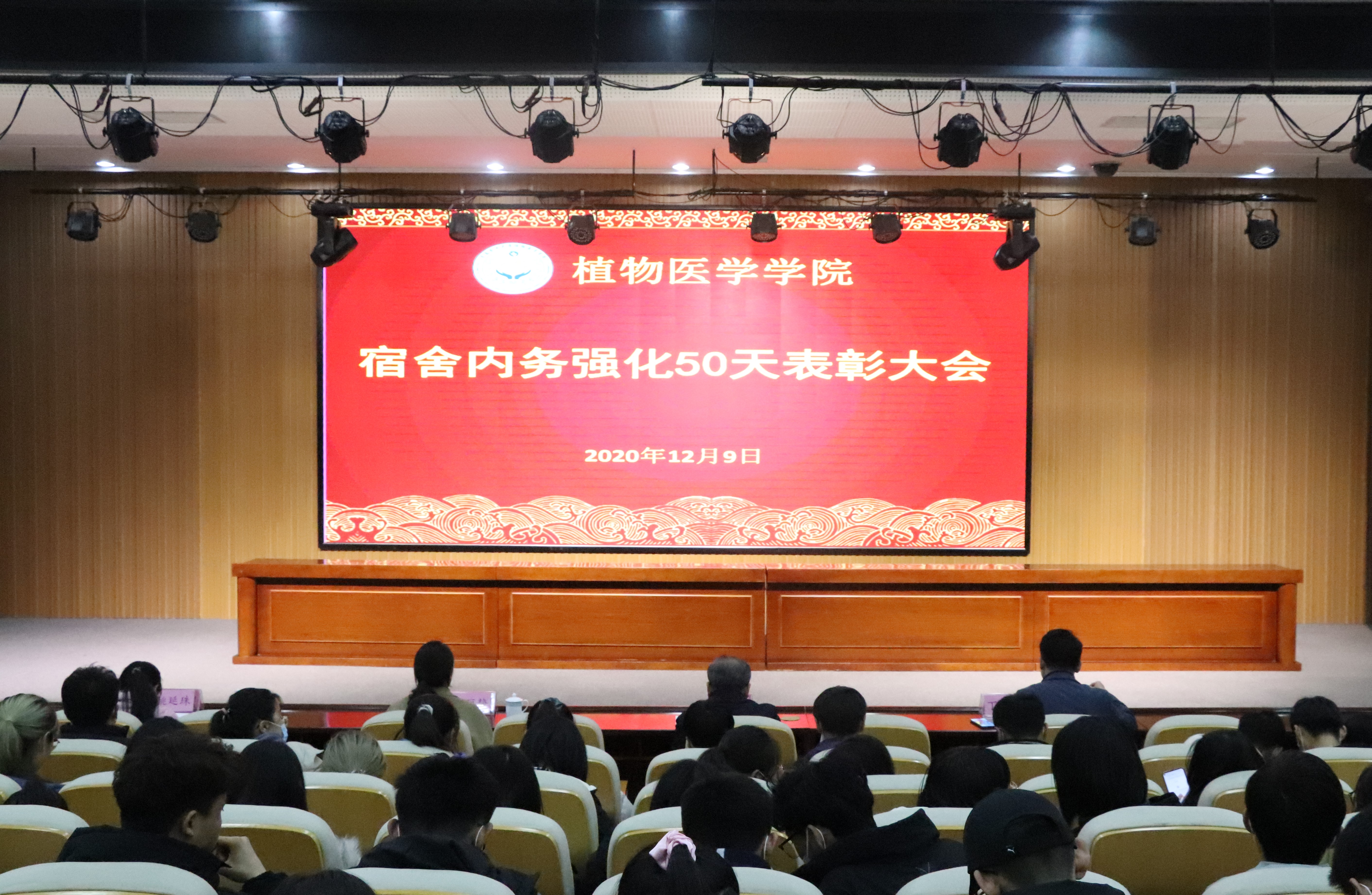 为加强宿舍内务管理,表彰优秀榜样,12月9日,植物医学学院于学术会馆第二学术报告厅举办内务强化50天表彰大会。党总支副书记、副院长李军,团委书记王丽静,辅导员丁晨、姚延珠出席,会议由植物医学学院学生会秘书处姚祎琳主持,学院2020级全体同学参加。