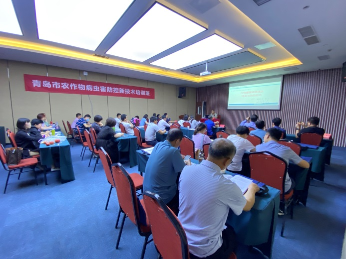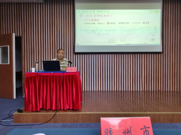 2022年6月1日下午,植物医学学院赵洪海教授作为青岛市农技中心的特邀培训专家之一,为青岛市“全市农作物病虫害防控新技术培训班”植物检疫培训班50余名植保植检管理人员和植保种植专业合作社技术人员,作题为《重要植物病原线虫检测与防控技术》的专题授课。赵洪海教授针对青岛市的优势作物产业特点和线虫有害生物危害及潜在危害风险,充分发挥自己的植物线虫学专业特长,并结合本研究团队前期的调研实践,讲解了植物线虫的基本知识、作物重要性病原线虫的发生特点与识别检疫、作物重要植物病原线虫防控技术等内容,重点介绍了腐烂茎线虫、根结线虫、马铃薯金线虫的发生危害特点、检验检测方法和防控技术,讨论了植物线虫防治中存在的主要问题,并从加强调查研究和宣传培训力度、建立完善可持续防控技术推广应用体系等方面提出建议。青岛市农技中心副主任李晓东正高级农艺师、山东省农技中心植检组负责人张德满正高级农艺师参加培训会,培训会由市农技中心植保部负责人王连刚正高级农艺师主持。