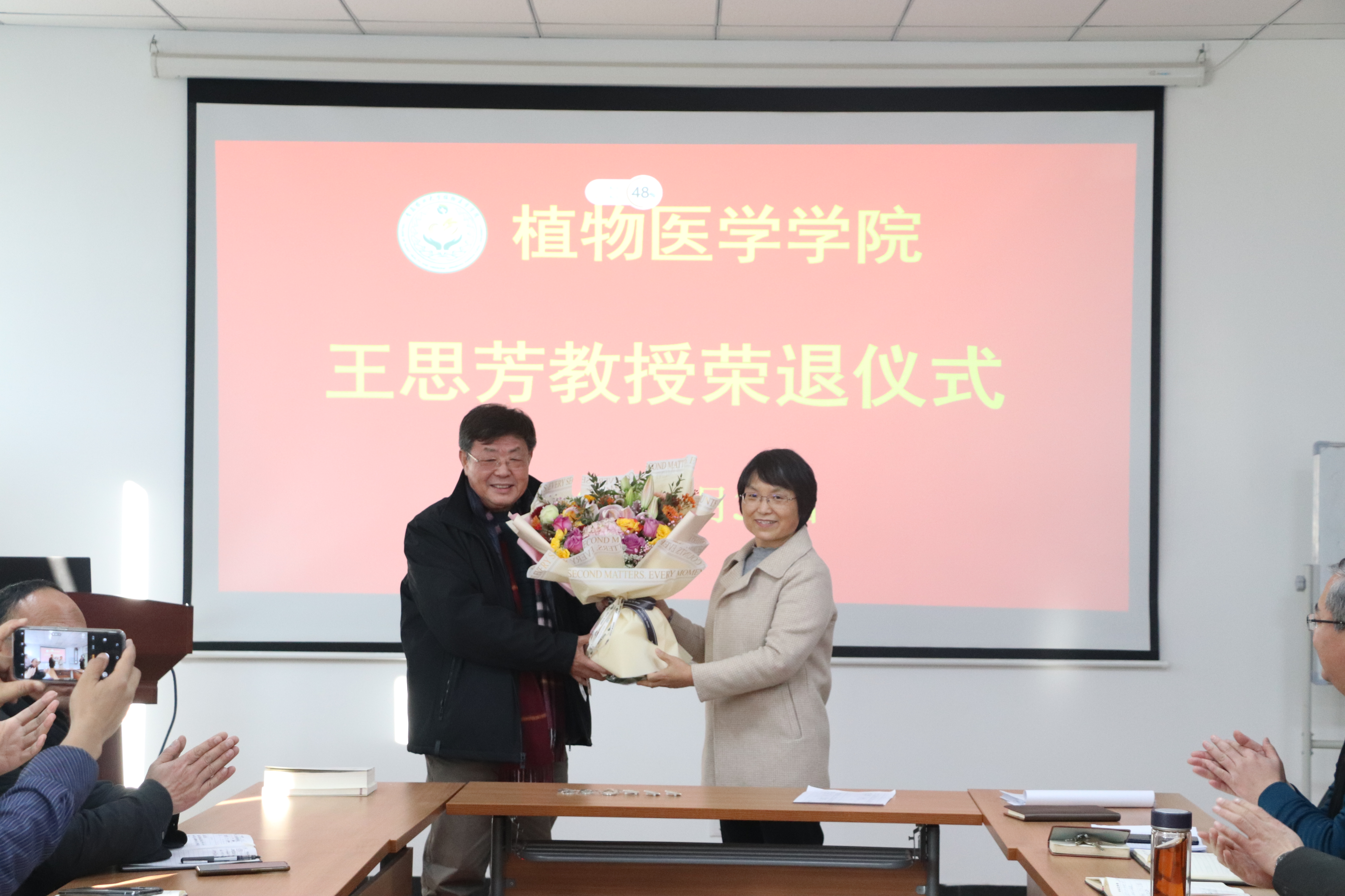 王思芳老师荣退仪式上,韩强首先对王思芳老师的从教经历和先进事迹进行了介绍,对其为学院和植保学科的建设发展所付出的辛勤劳动表示衷心感谢,同时真诚地希望王思芳老师退休不退志,离岗不离心,继续关心和支持学院和植保学科的建设和发展,继续关心和支持学院青年教师的成长和进步。刘同先为王思芳老师送上鲜花和全院教职工共同完成的临别寄语手册,祝福王老师身体健康,家庭幸福。王思芳老师发表了退休感言,感谢学院一直以来对其工作的关心、支持,感谢学院全体教职工对自己的支持、帮助,希望学院在今后的事业发展中继往开来、再创辉煌。