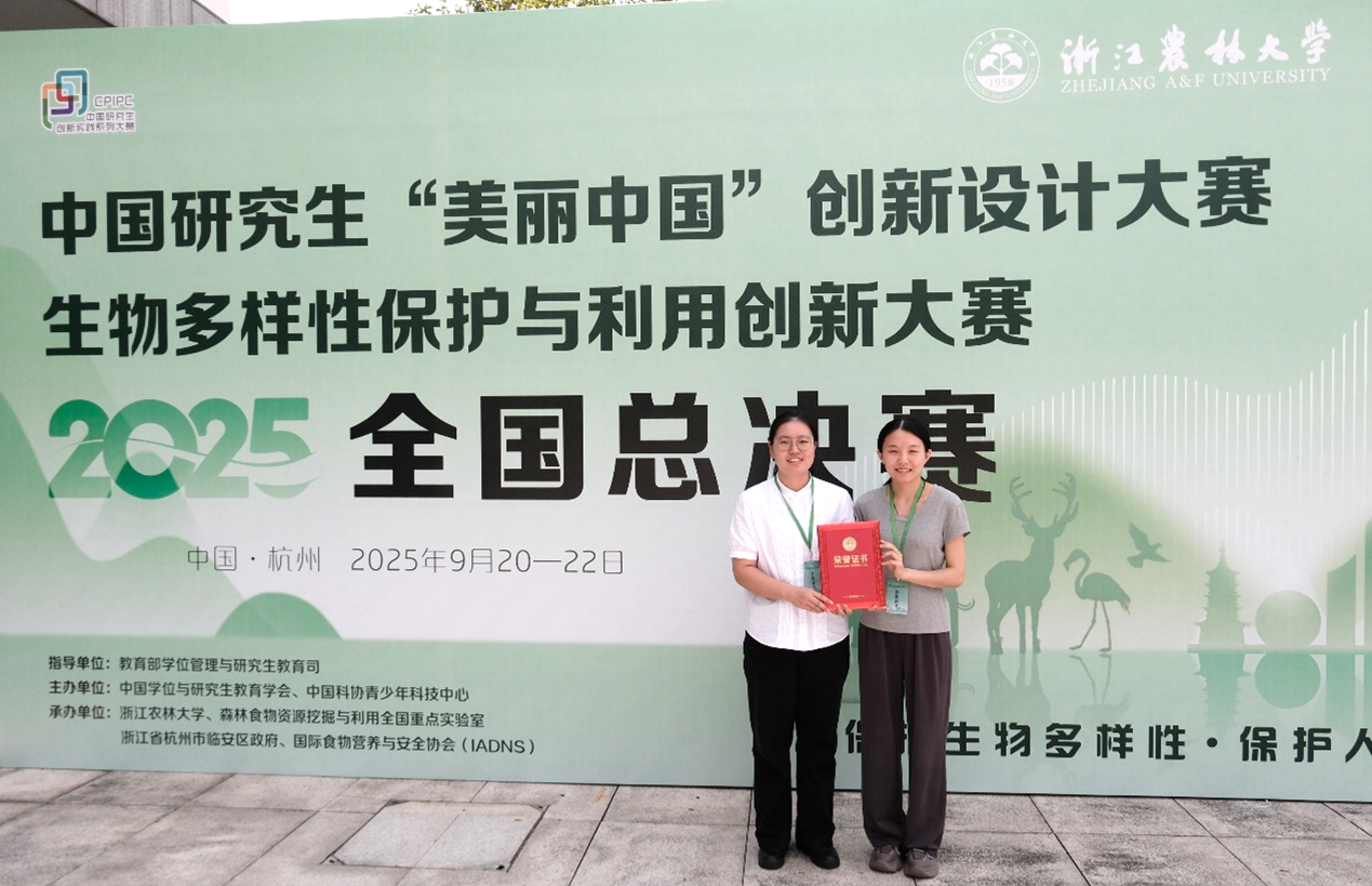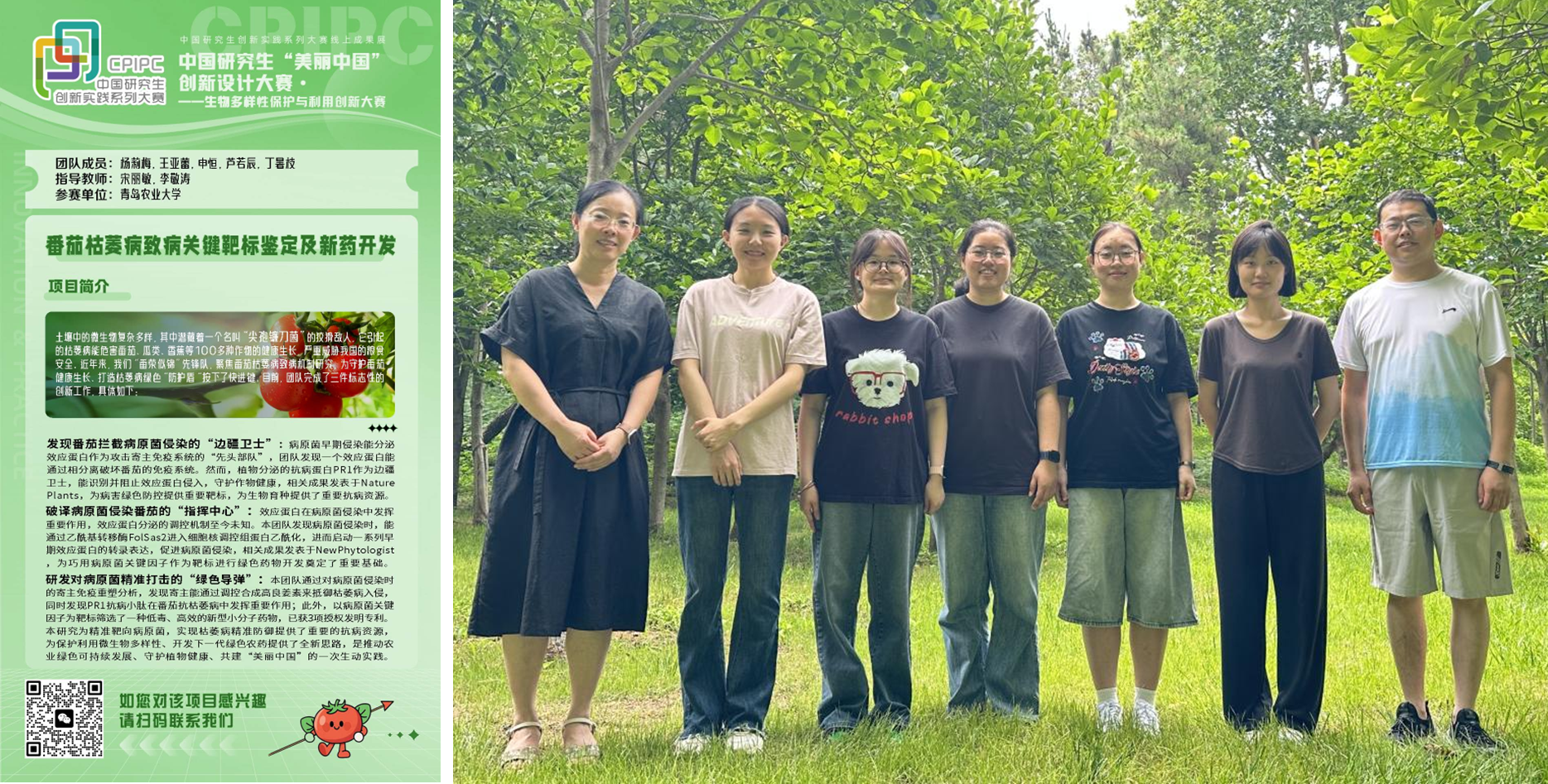 2025年9月20日至22日,中国研究生“美丽中国”创新设计大赛—生物多样性保护与利用创新大赛全国总决赛在杭州浙江农林大学举行。青岛农业大学植物医学学院“番荣似锦”先锋队(团队成员:杨莉梅、王亚蕾、申恒、芦若辰、丁暑枝;指导教师:宋丽敏、李敬涛)凭借项目《番茄枯萎病致病关键靶标鉴定及新药开发》荣获全国二等奖,展现了学校在植物病害绿色防控与生物多样性保护方面的科研实力与创新水平。