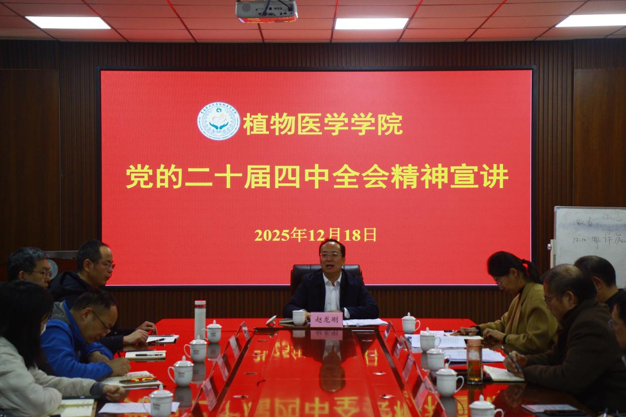 12月18日,青岛农业大学植物医学学院在学院会议室开展党的二十届四中全会精神专题宣讲。校党委委员、统战部部长赵龙刚主讲,植物医学学院班子成员、系主任、各党支部委员、研究生党支部全体党员参加。