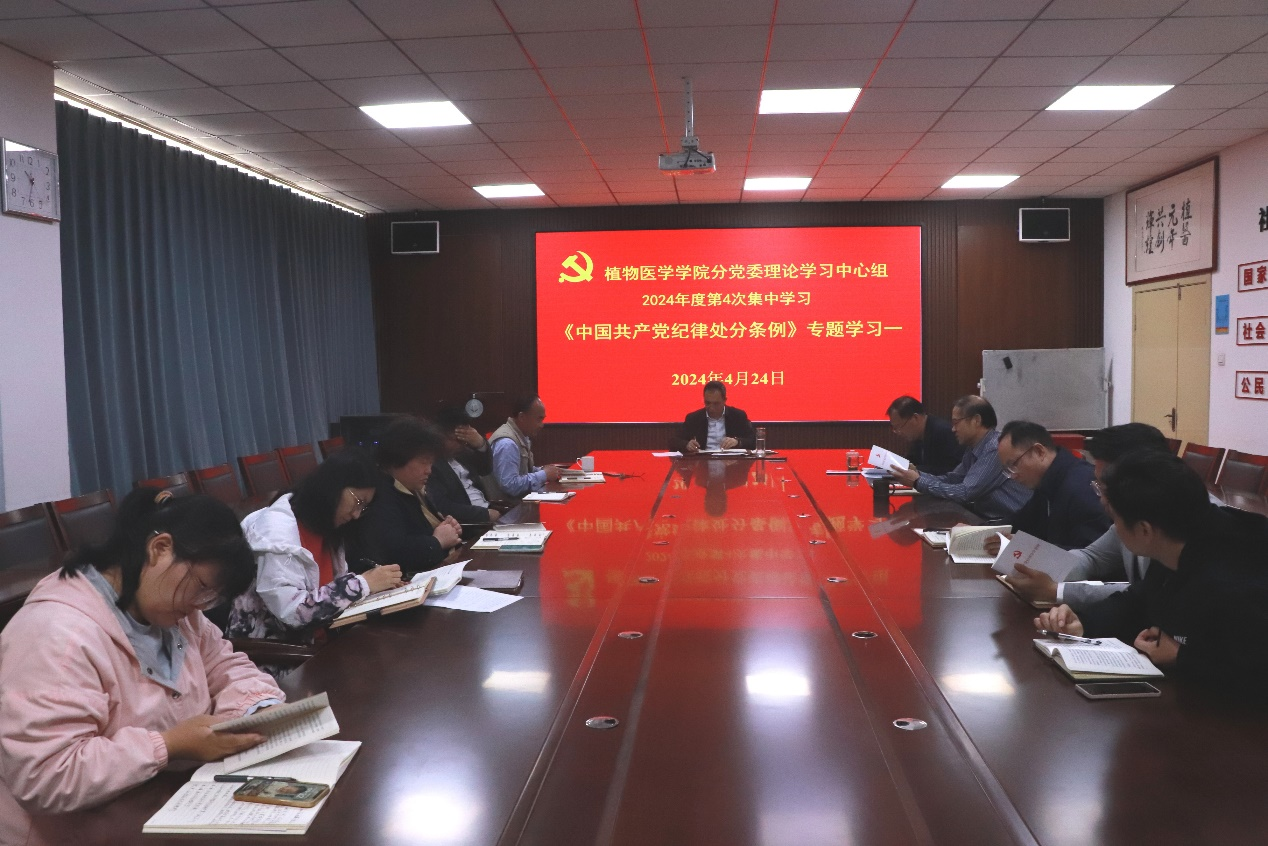4月24日,青岛农业大学植物医学学院在学院会议室开展2024年度第4次党委理论学习中心组集中学习,深入学习《中国共产党纪律处分条例》,会议由学院党委书记韩强主持,党委理论中心组全体成员参加。