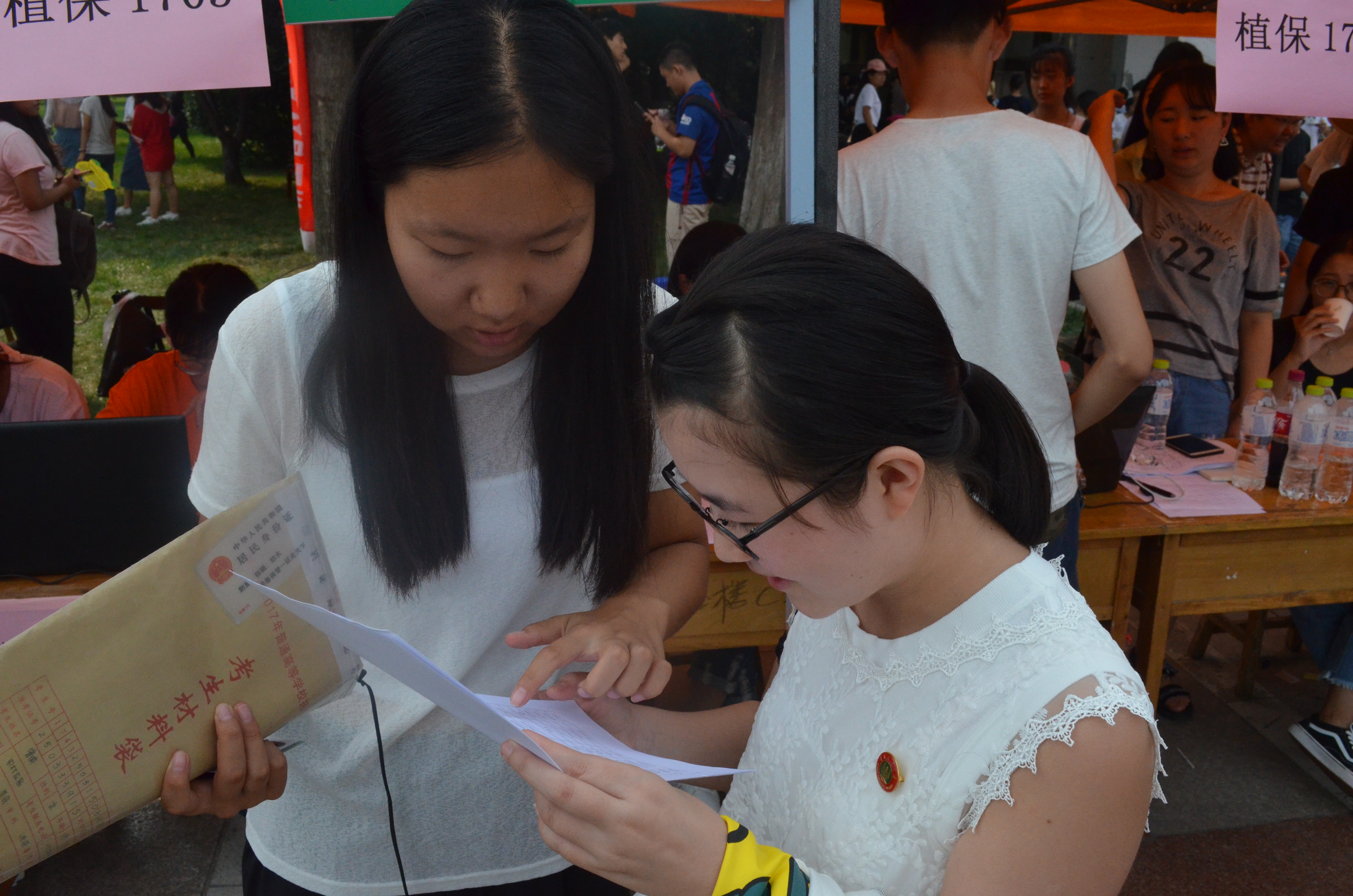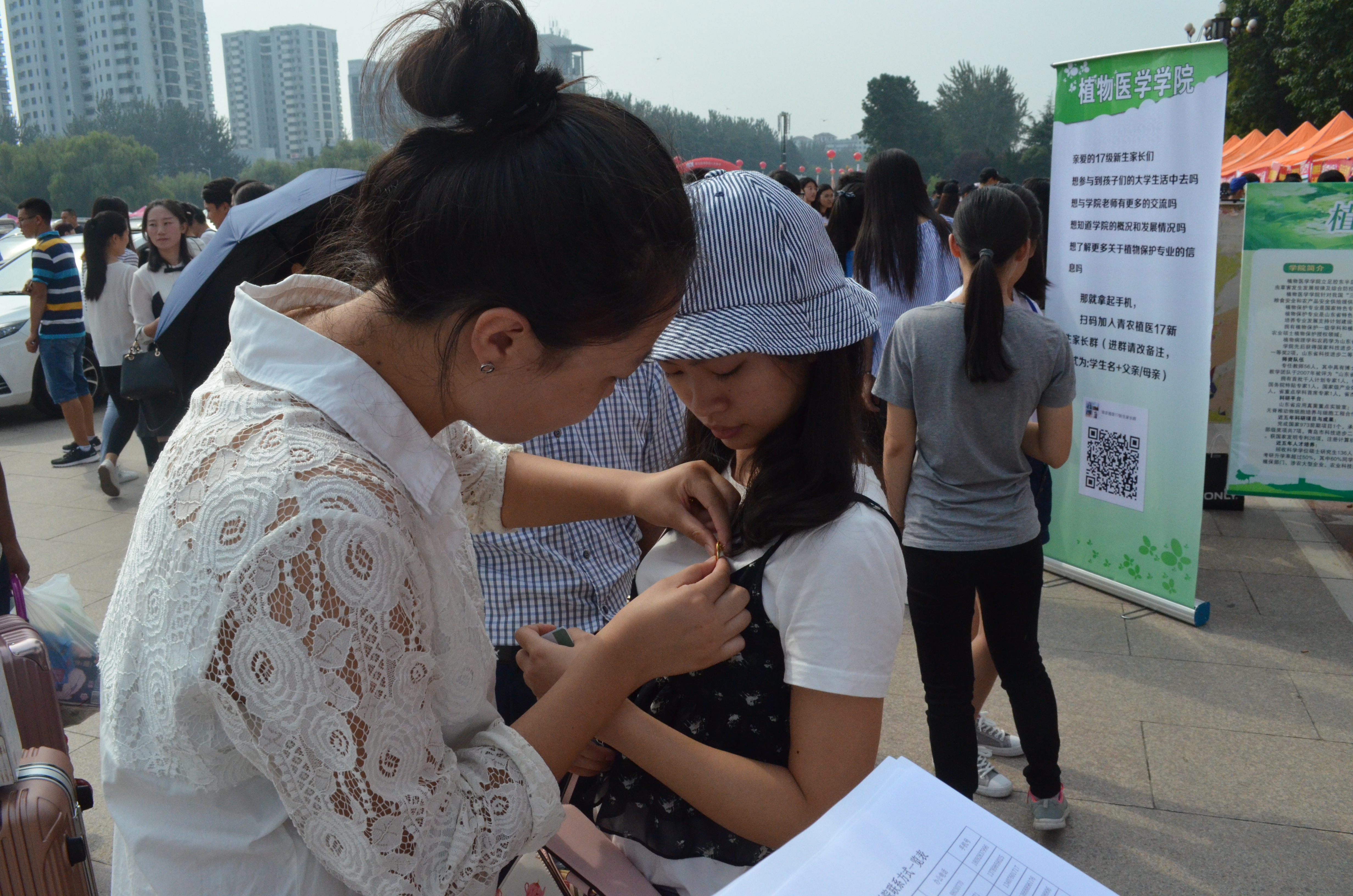 在新生们办理完入学登记之后,迎新现场为他们安排了一个小小的校徽佩戴仪式。这个小小的仪式不仅是新生老生促进交流的桥梁,更是学院文化薪火相传的纽带。一枚小小的校徽,不仅让新生有了归属感,更是新生成为青农人的标志。