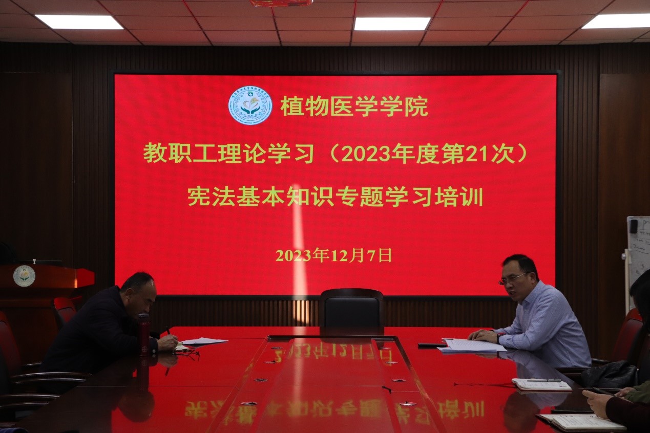 12月7日,青岛农业大学植物医学学院于学院会议室开展2023年度第21次教职工理论学习,深入学习宪法知识,弘扬宪法精神。会议由学院党委书记韩强主持,全体教职工参加。