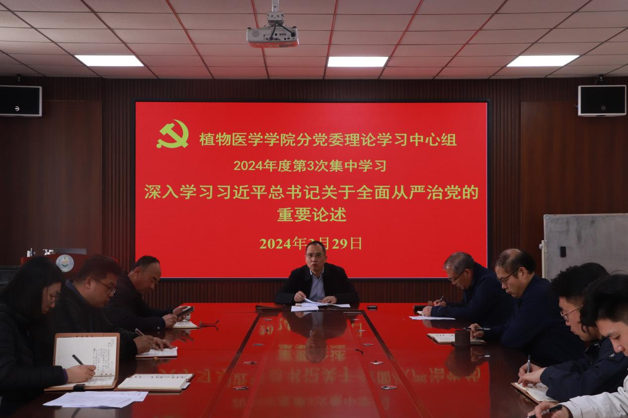 3月29日,青岛农业大学植物医学学院在学院会议室开展2024年度第3次党委理论学习中心组集中学习,深入学习习近平总书记关于全面从严治党的重要论述,会议由学院党委书记韩强主持,学院党委理论学习中心组全体成员参加。
