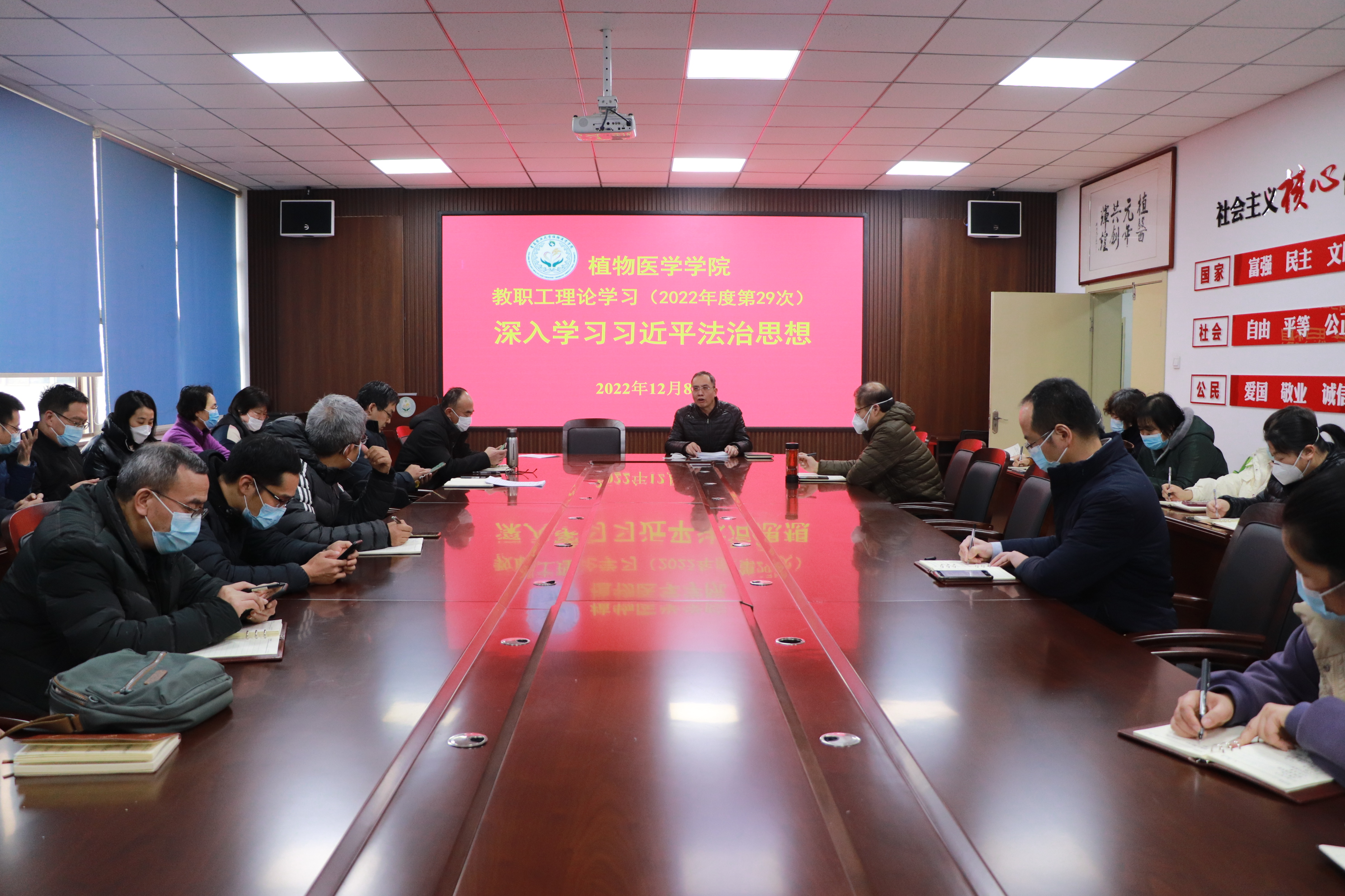12月8日,青岛农业大学植物医学学院全体教职工在学院会议室开展2022年度第29次学习,深入学习习近平法治思想。会议由学院党委书记韩强主持,全体教职工参加。