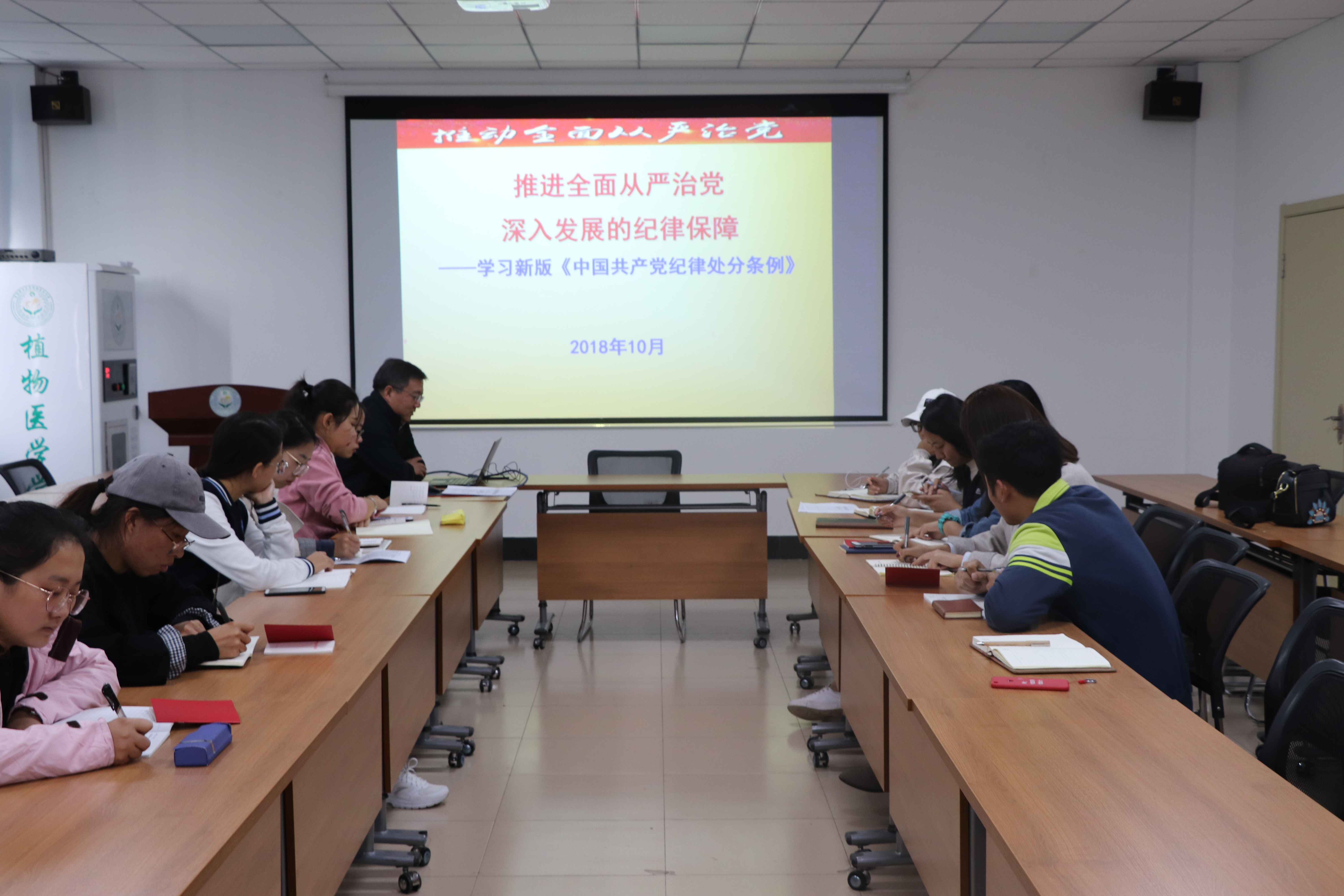 10月24日,植物医学学院第三党支部在生物楼N406开展双周政治学习,本次学习邀请学院党总支副书记、副院长李军为全体党员解读《中国共产党纪律处分条例》,支部全体党员参加。
