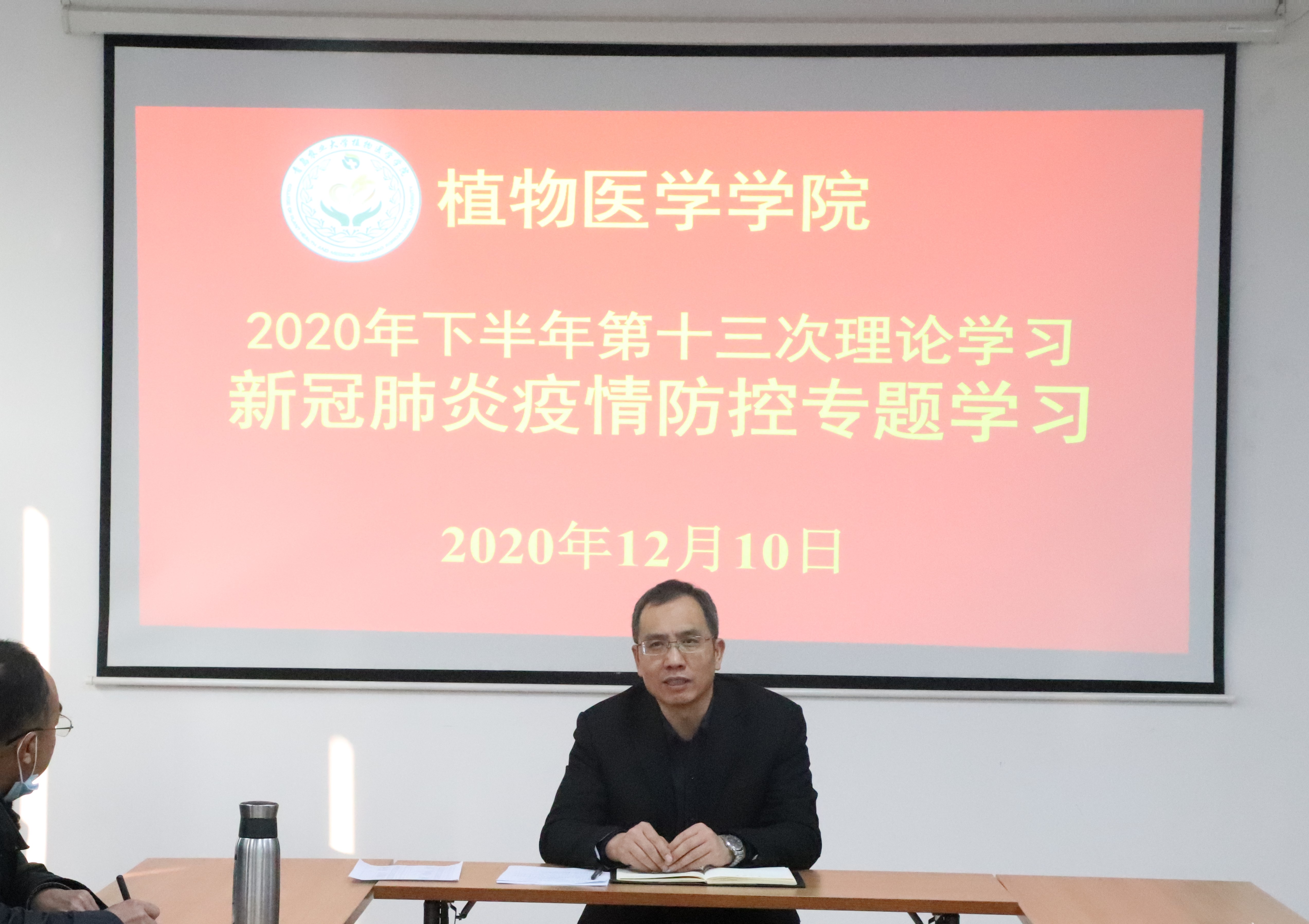12月10日,植物医学学院于学院会议室召开本学期第十三次教职工理论学习,专题学习新冠肺炎疫情防控有关知识,安排部署冬季新冠肺炎疫情防控工作。学院党总支书记韩强主持会议并讲话,学院全体教职工参加。