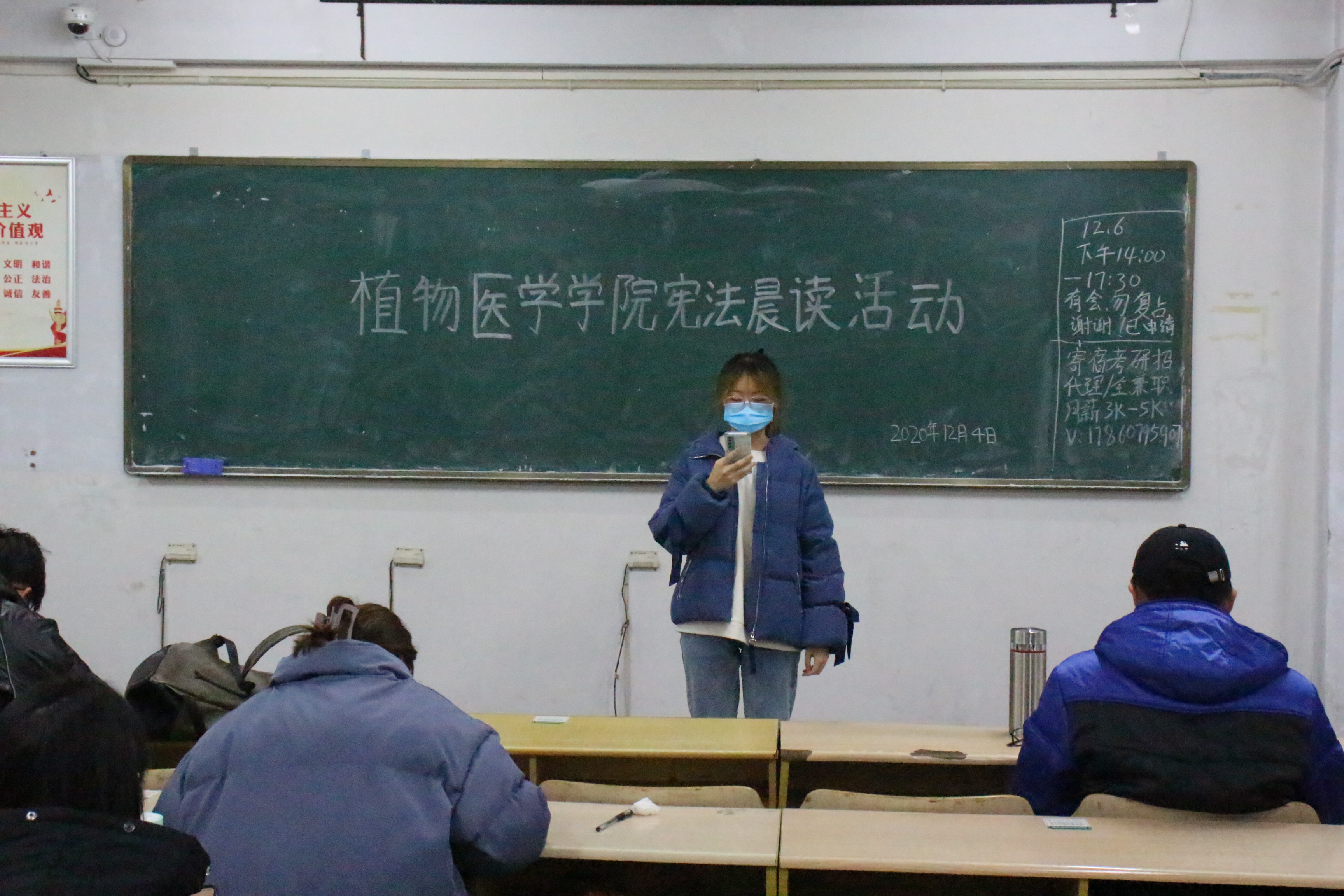 为进一步向学生普及法律制度,增进学生对宪法知识的了解,12月4日,在第七个国家宪法日到来之际,植物医学学院于教学区有序开展“宪法晨读”活动,本次活动由学院学生会学术部主办,2019、2020级全体同学参加。