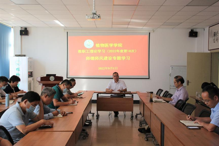 为了全面加强师德师风建设工作,提高教师立德育人能力,9月1日,青岛农业大学植物医学学院在学院会议室开展教职工理论专题学习,深入学习师德师风建设,会议由党总支书记韩强主持。