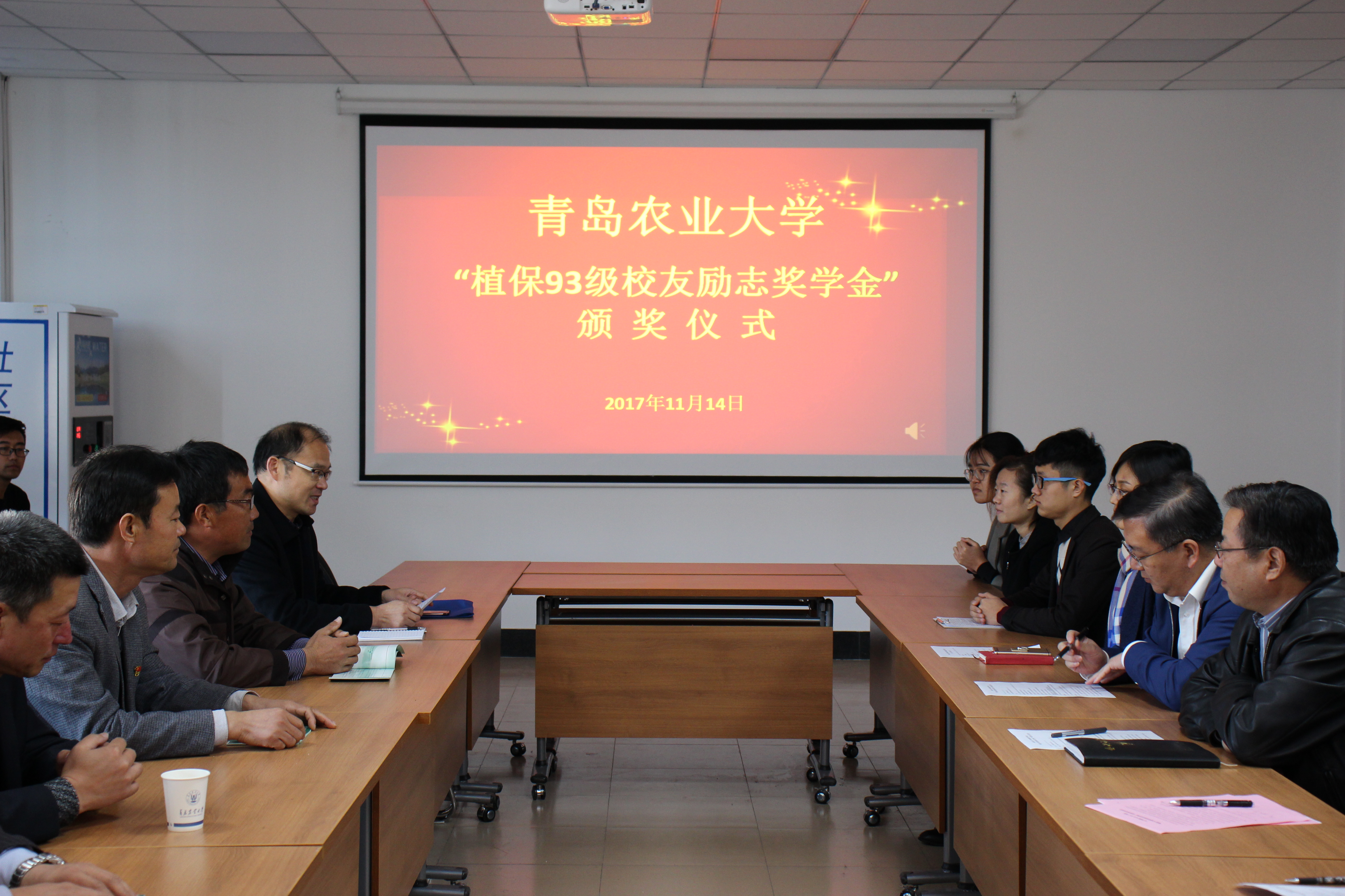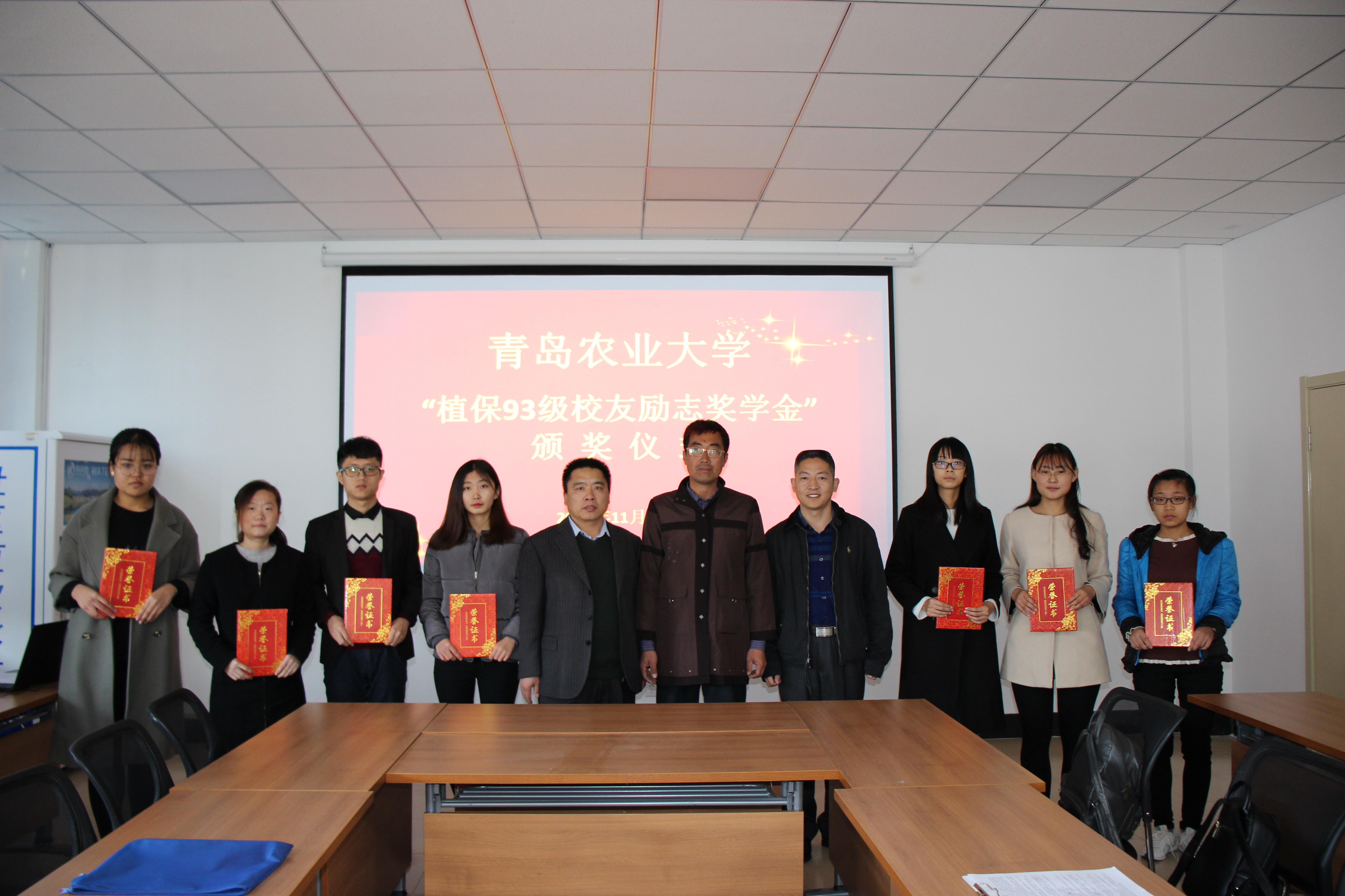 11月14日,植物医学学院“植保93级校友励志奖学金”颁奖仪式在生物楼N406召开,植物医学学院党总支书记袁忠林,植物医学学院副院长赵洪海,植保93级校友、临沂市沂水县高庄镇党委书记王稼祥,植保93级校友、昌乐县农业局副局长高瑞华,植保93级校友、乳山市俩大学生枣园家庭农场场长邹均亭,植保93级校友、植物医学学院教授黄金光,植保93级校友、植物医学学院副教授周善跃,植物医学学院团委书记马伟萍,辅导员王丽静出席本次颁奖仪式,会议由植物医学学院党总支副书记李军主持,获奖学生和16、17级部分学生代表参加。