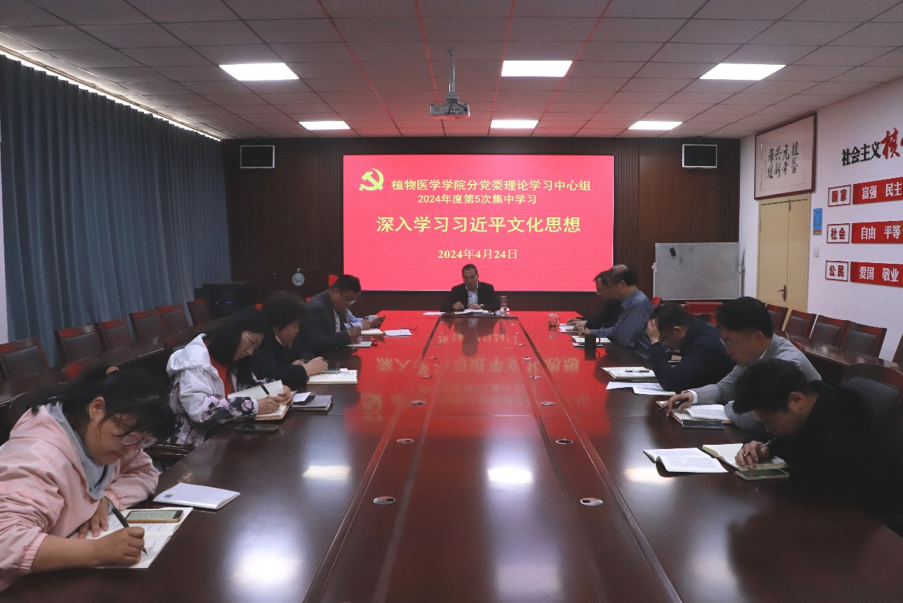 4月24日,青岛农业大学植物医学学院在学院会议室开展2024年度第5次党委理论学习中心组集中学习,深入学习习近平文化思想,会议由学院党委书记韩强主持,学院党委理论学习中心组全体成员参加。