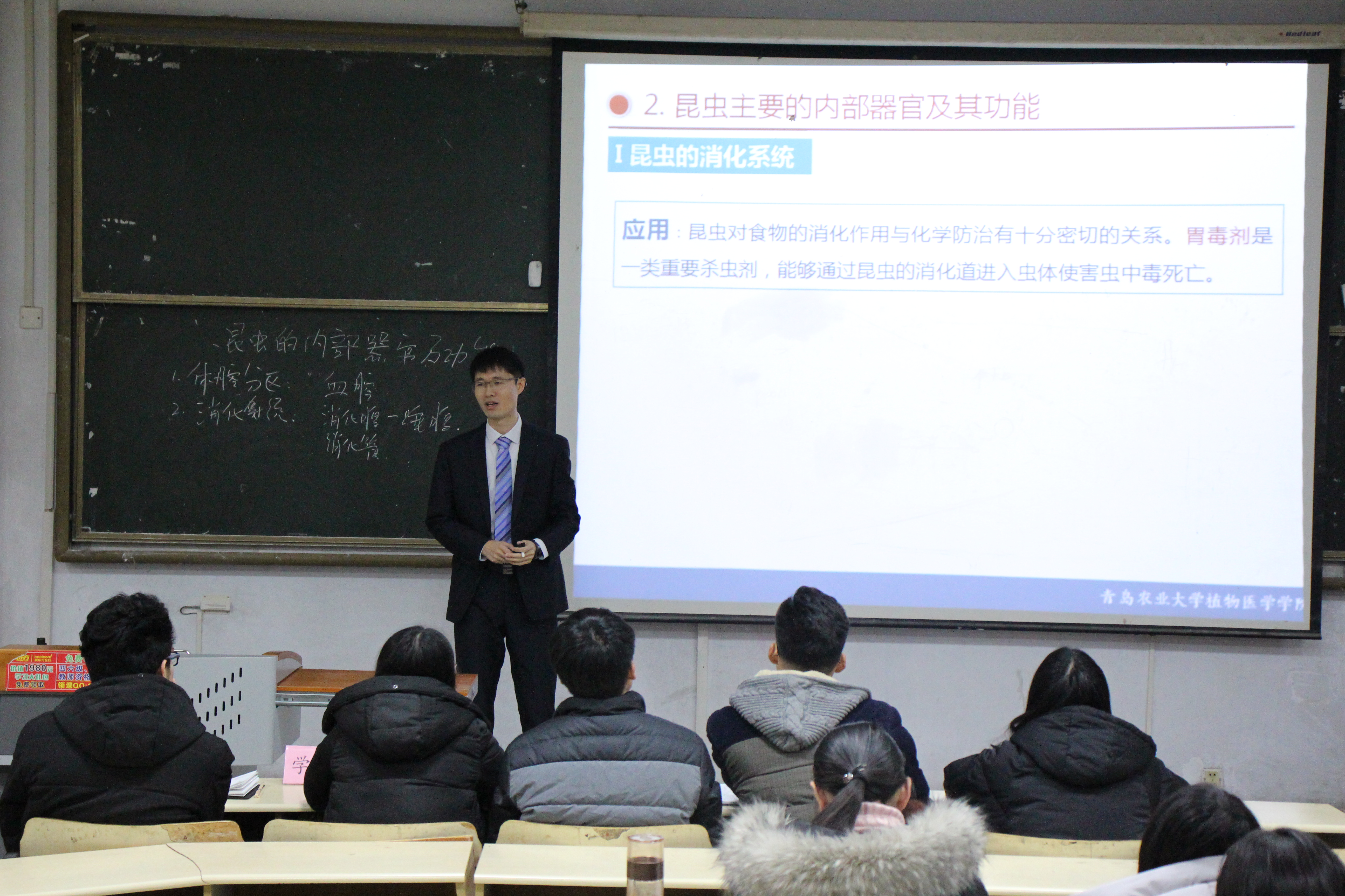 “看昆虫就要像看女孩一样,不能只看外表,还要看到内心”,丁天波以一句幽默的比喻引出了自己的主讲题目——昆虫的消化系统。丁天波将昆虫的消化系统与人体的消化系统相比较,强调了两者之间的异同点,从昆虫的前肠、中肠和后肠以及其组成部分,详细地展示了昆虫的消化道以及他们的作用。授课期间丁天波讲授思路清晰,语言生动活泼,适时结合实际案例,将晦涩的专业术语变得通俗易懂。他通过问答的方式,不断与学生互动,提高了听课效率,巩固课程重难点,增强了学生将知识运用于实际的能力。