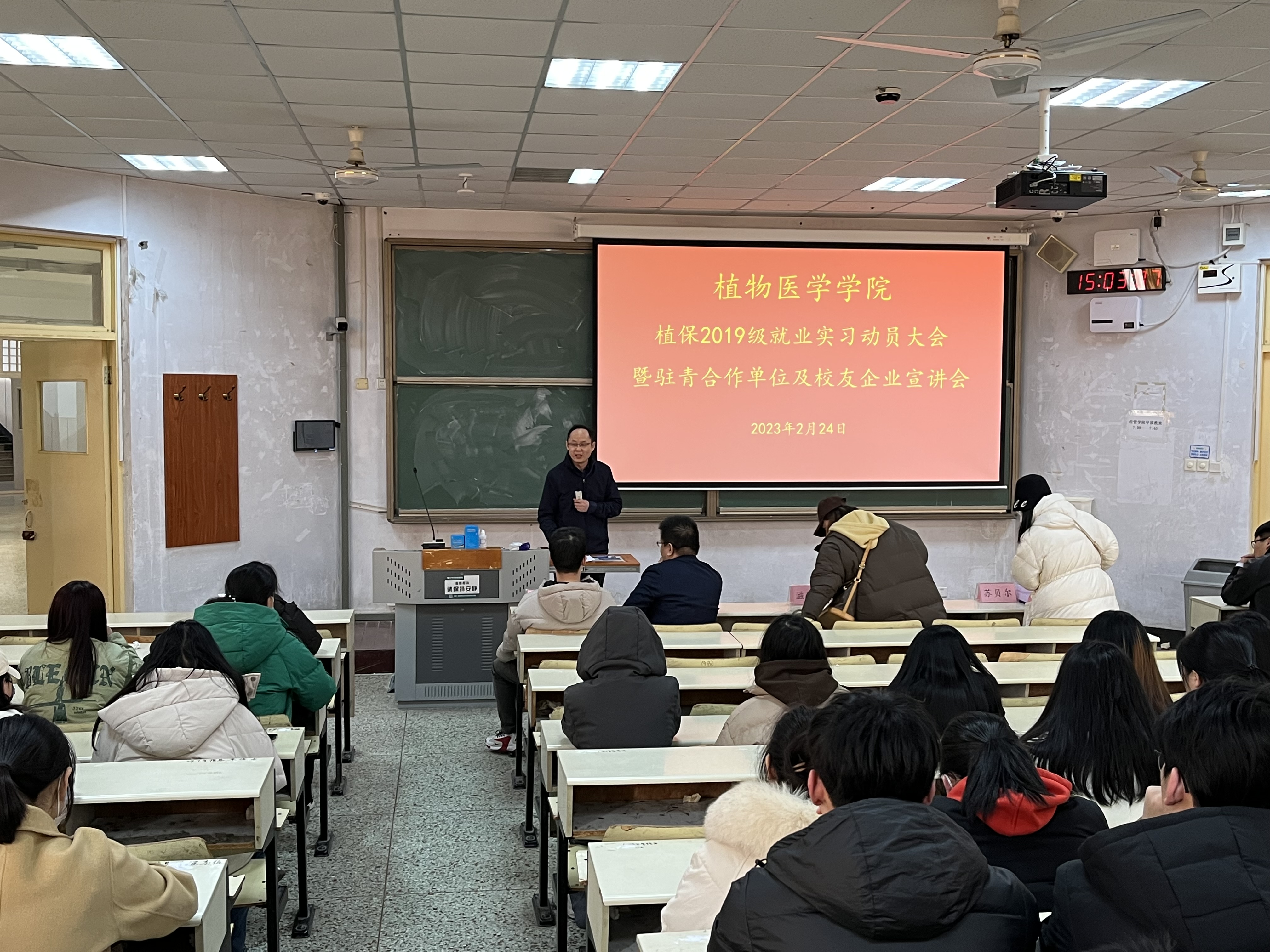 为切实做好2023届毕业生的毕业实习、就业指导工作,鼓励毕业生把握就业机遇,明确未来规划方向,积极与用人单位对接,2月24日,植物医学学院在教学区B304召开就业实习动员大会暨驻青合作单位及校友企业宣讲会,此次会议由学院植物病理学系主任练森主持,学院教学秘书郑伯平、辅导员丁晨及学院全体2023届毕业生参加。