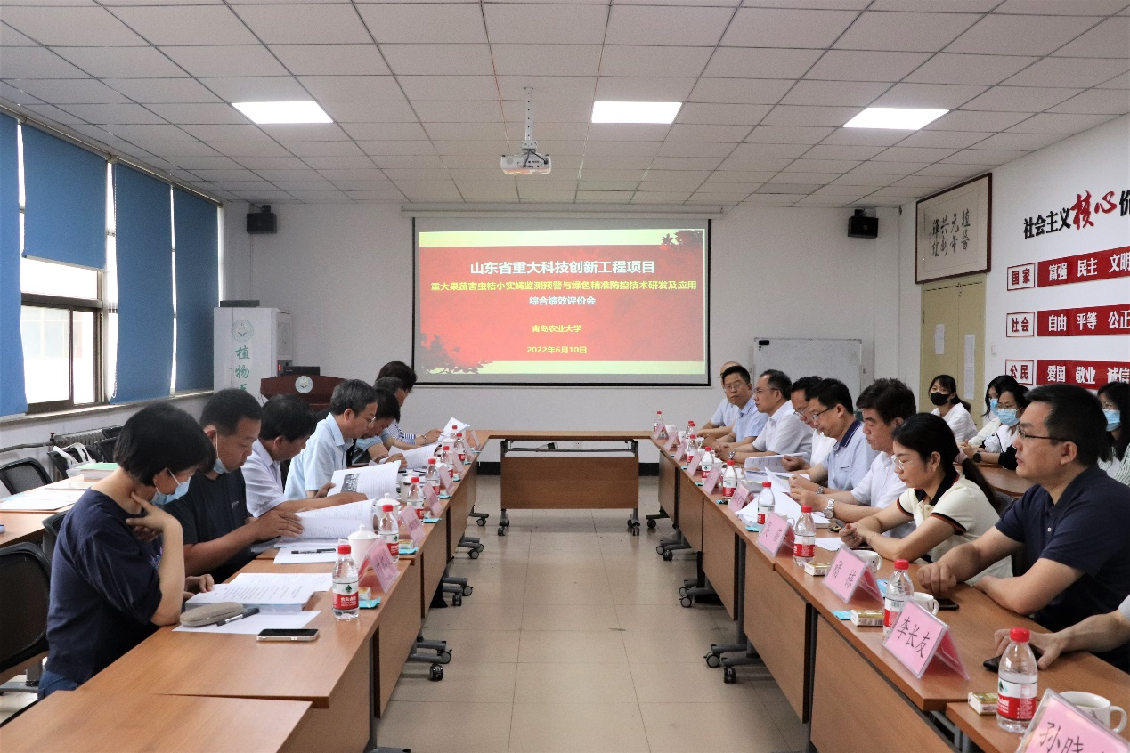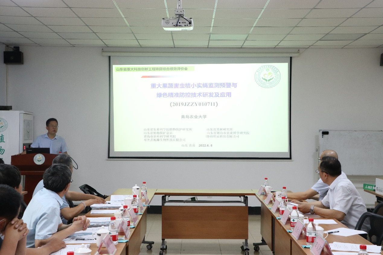 6月10日上午,由植物医学学院周洪旭教授主持的山东省重大科技创新工程“重大果蔬害虫桔小实蝇监测预警与绿色精准防控技术研发及应用”项目综合绩效评价会议在我校生物楼N406会议室召开。山东省科学技术厅农村科技处刘赤兵副处长莅临指导工作,山东农业大学教授许永玉、青岛市农业技术推广中心正高级农艺师李晓东、临沂市农业科学院果茶花卉研究所正高级农艺师彭金海、淄博市农业科学研究院研究员耿军、潍坊市农业科学研究院高级农艺师李付军、青岛正业税务师事务所注册会计师韩超、青岛正望新材料股份有限公司会计师叶红霞等七位综合绩效评价专家参会,青岛农业大学副校长田义轲、青岛农业大学科技处处长赵龙刚、青岛农业大学科技处副处长吴薇、青岛农业大学植物医学学院党总支书记韩强、青岛农业大学植物医学学院副院长褚栋及项目组成员参加了本次会议。会议由青岛农业大学科技处赵龙刚处长主持。
