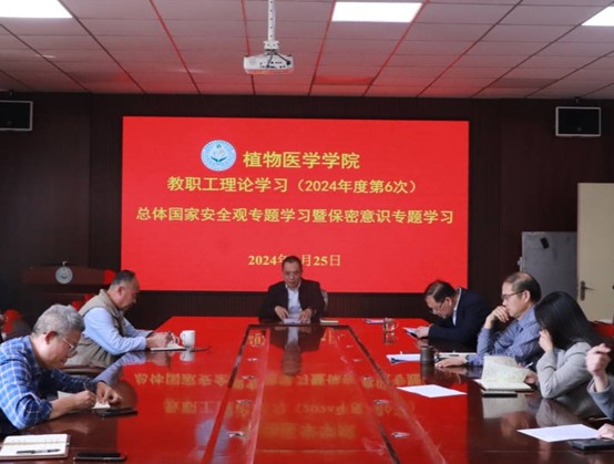 4月25日,青岛农业大学植物医学学院在学院会议室开展2024年度第6次教职工理论学习,总体国家安全观专题学习暨保密意识专题学习。会议由学院党委书记韩强主持,全体教职工参加。