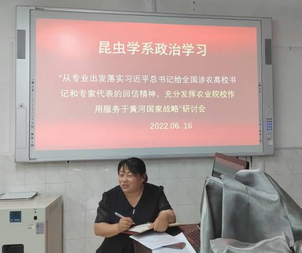 2022年6月16日下午,昆虫学系在生物楼B514开展政治理论集体学习,会议由系主任孙丽娟老师主持,全体昆虫学系老师参加,此次学习主题为“从专业出发落实习近平总书记给全国涉农高校书记和专家代表的回信精神,充分发挥农业院校作用服务于黄河国家战略“,在会议上各位老师认真领会,并开展了热烈研讨,从学习和实践角度提出了贯彻上述战略的意见和举措。主要包括:(1)赴黄河三角洲实地考察,切实充分发挥地理优势;(2)从学院层面设立专业平台,集全学院专业优势解决黄河三角洲农业生产问题;(3)积极与黄河三角洲农业高新技术产业示范区、东营市农业科学院等单位进行对接,在病虫害绿色防控、生物多样性调查等方面开展合作研究,助推黄河三角洲生态保护和高质量发展;(4)在黄河三角洲病虫害防控中实施双减战略,保护生态环境及粮食安全生产;(5)利用昆虫作为指示性生物结合自然恢复、退耕还湿以及退养还滩等措施开展盐碱地生态监测和评估,助力黄河流域生态保护。