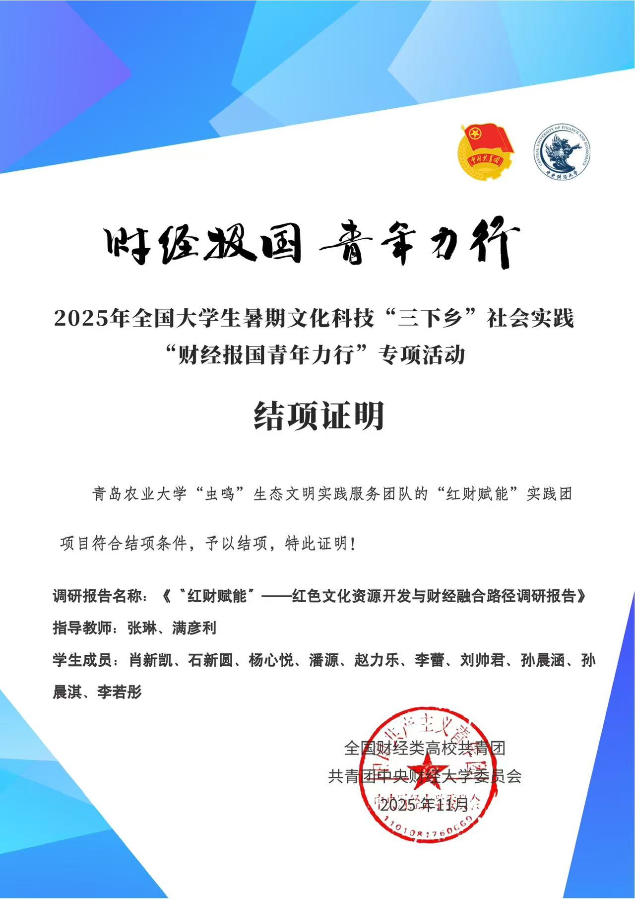近日,根据《2025年全国大学生暑期文化科技“三下乡”社会实践“财经报国青年力行”专项活动方案》,在共青团中央青年发展部指导下,中央财经大学牵动全国财经类高校共同开展2025年全国大学生暑期文化科技“三下乡”社会实践“财经报国青年力行”专项活动,得到全国各高校团队的广泛关注和积极参与。为进一步总结凝练成果,主办方对300支入选专项活动团队的结项材料进行审核,决定对262支团队予以结项。其中,我院“虫鸣”生态文明实践服务团经主办方审核后准予结项。