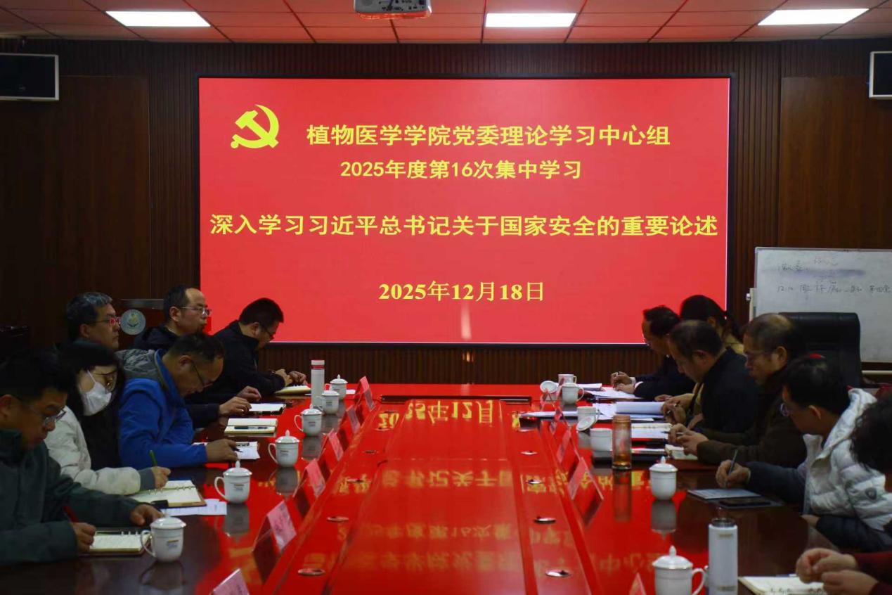 12月18日,青岛农业大学植物医学学院党委理论学习中心组于学院会议室开展2025年度第16次集体学习,深入学习习近平总书记关于国家安全的重要论述。校党委委员、统战部部长赵龙刚列席指导。会议由学院党委书记王丽静主持,学院党委理论学习中心组全体成员参加。