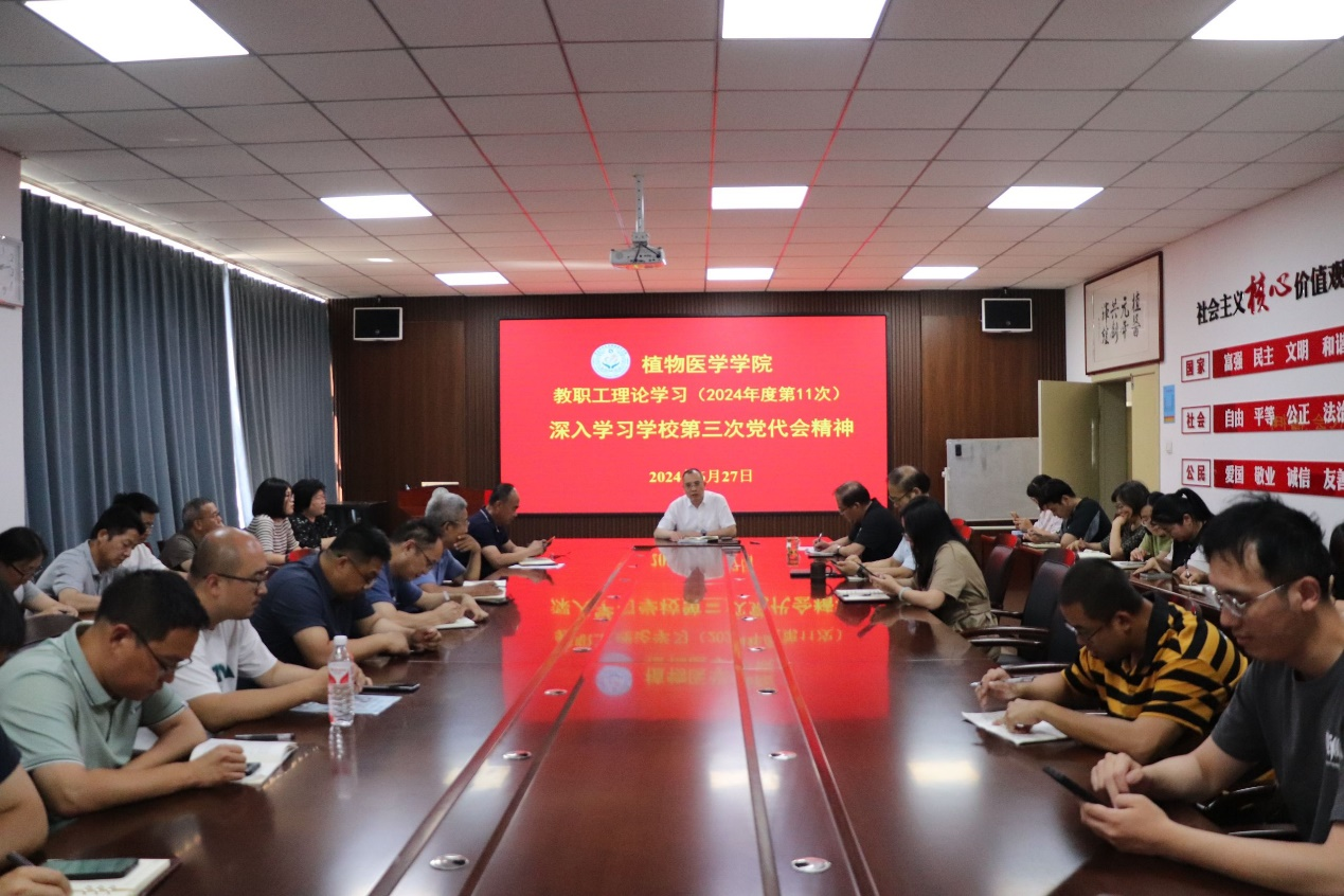 6月27日,青岛农业大学植物医学学院在学院会议室开展2024年度第11 次教职工理论学习,深入领会和贯彻中国共产党青岛农业大学第三次党员代表大会精神。会议由学院党委书记韩强主持,全体教职工参加。