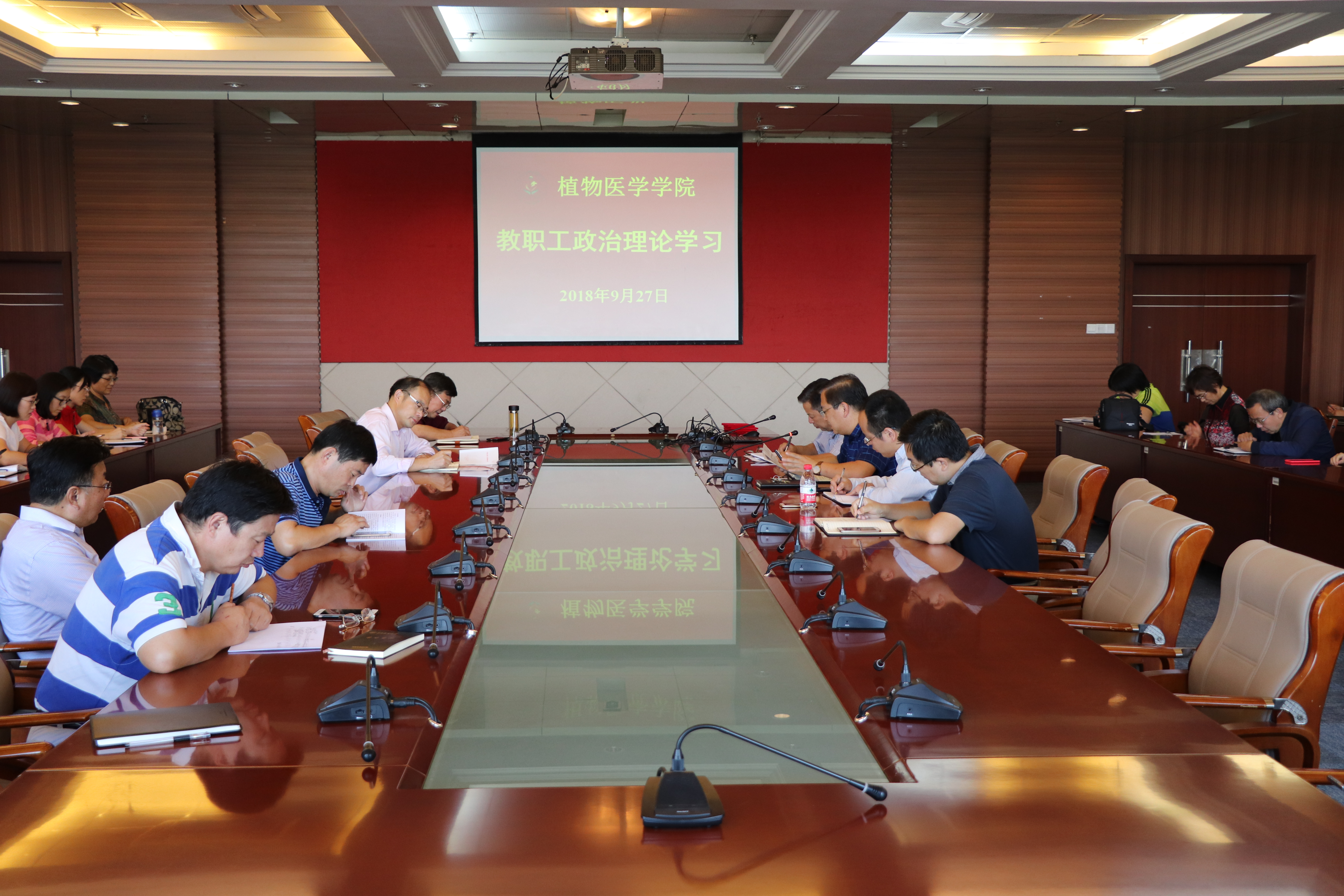 9月27日下午,植物医学学院在主楼三楼会议室召开教职工政治理论学习会,会议由党总支书记袁忠林主持,学院全体教职工参加。