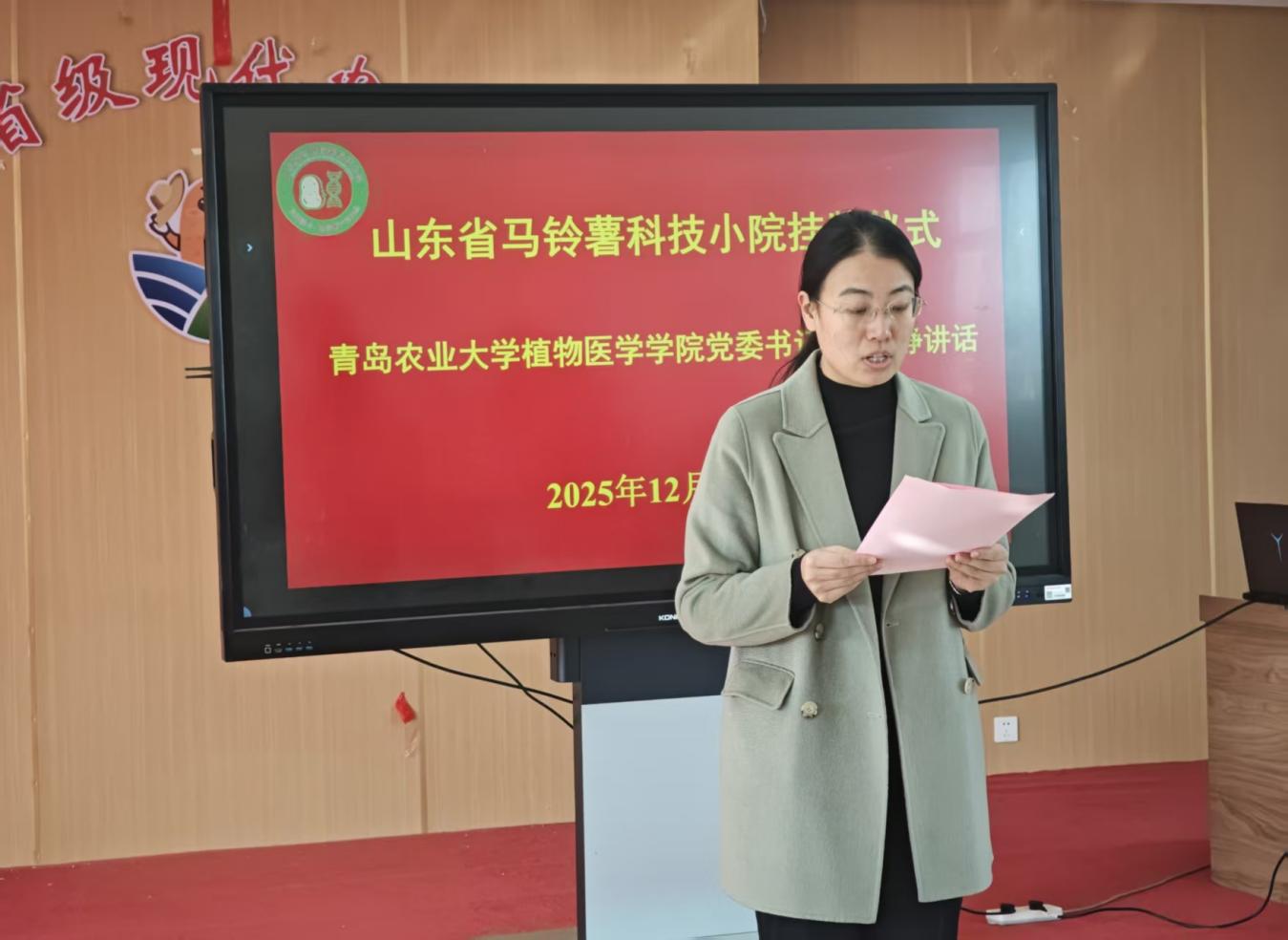 近日,山东胶州马铃薯科技小院签约揭牌仪式在青岛胶州苑戈庄省级现代农业产业园举行。青岛农业大学党委委员、统战部部长赵龙刚,研究生处副处长杨洲,植物医学学院党委书记王丽静,植物医学学院党委副书记、副院长贾永超,青岛市农业技术推广中心,青岛市科学技术协会,胶州市科学技术协会等相关领导嘉宾参加揭牌仪式。仪式由青岛农业大学植物医学学院副书记、副院长贾永超主持。.jpg)