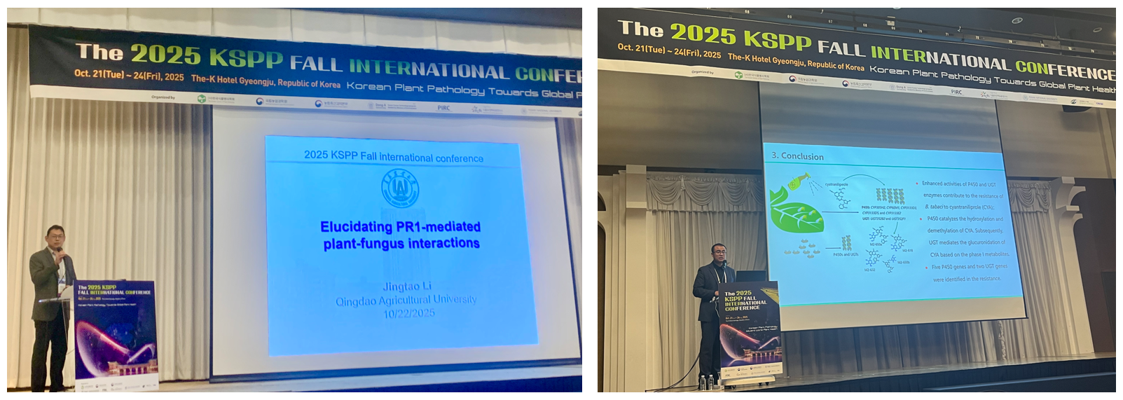 此外,青岛农业大学李敬涛教授、郭磊副教授受邀参加了2025年韩国植物病理学会秋季国际会议,并分别作了精彩的学术报告,在分享我校植物病理领域最新研究成果的同时,引发了与会各国学者的关注与讨论,更加有力地推动了我校与国外同行的深度交流与合作。