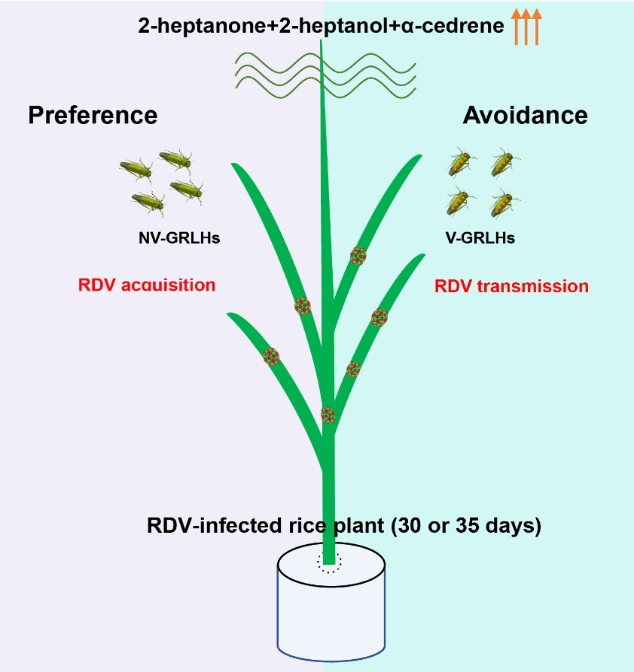 研究团队以水稻矮缩病毒及其媒介昆虫黑尾叶蝉为研究对象,通过系列系统寄主偏好实验表明了寄主植物感染病毒30天后,介体昆虫开始展现上述条件偏好性并持续了5天的时间;进一步分析发现在介体昆虫出现条件偏好性的时期,病毒诱导水稻产生了3种差异挥发物(2-庚酮、2-庚醇和α-柏木稀)。采用单一标准品处理显示,2-庚酮吸引不带毒介体昆虫的同时驱避带毒介体,而2-庚醇对不带毒介体无作用却显著驱避带毒介体,α-柏木稀对不带毒介体无作用却显著吸引带毒介体。可见单一挥发物并不能调控介体昆虫的条件偏好性。混合标准品处理揭示,3种混合挥发物吸引不带毒介体的同时驱避带毒介体,并促进了介体对病毒的获取和传播。