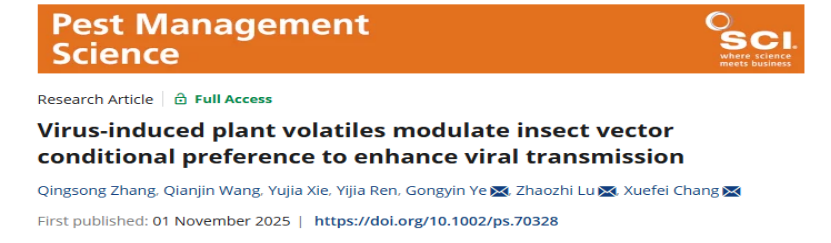 近日,青岛农业大学植物医学学院吕昭智教授团队在国际知名期刊《Pest Management Science》(中科院一区TOP期刊)上发表了题为“Virus-induced plant volatiles modulate insect vector conditional preference to enhance viral transmission”(https://doi.org/10.1002/ps.70328)的研究论文。该研究系统揭示由病毒诱导的3种混合挥发物调控了介体昆虫展现条件偏好性的初始阶段,并促进了病毒的传播扩散,这些发现将为通过操纵植物挥发物调节昆虫媒介种群来控制病毒传播提供一个关键的窗口期。