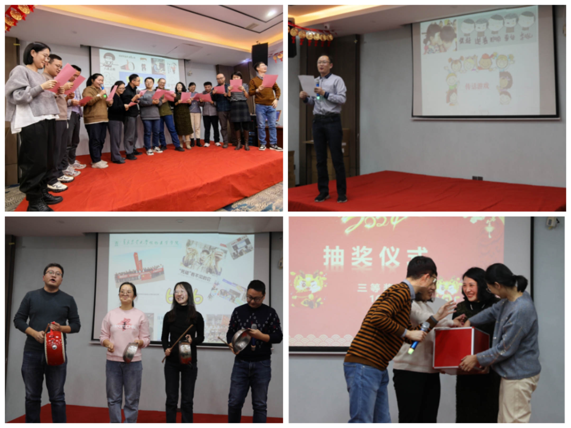 联欢会上,老师们自编自演的节目内容丰富,精彩纷呈。有幽默风趣的诗朗诵、精彩绝伦的歌曲演唱、笑翻全场的三句半和别出心裁的游戏表演。老师们既当演员,又当观众,现场气氛热烈,掌声此起彼伏。