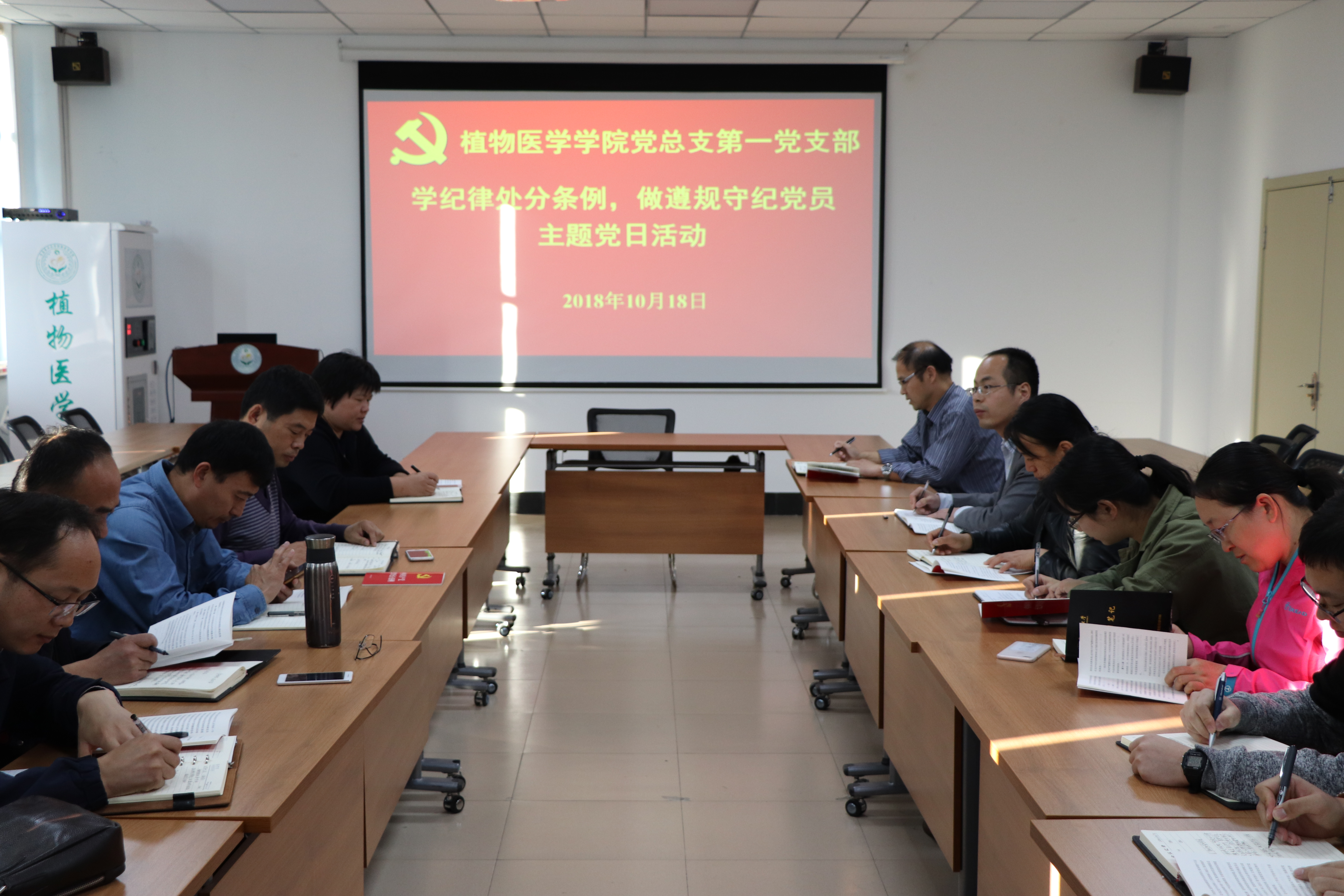 10月18日,植物医学院第一党支部在学院会议室召开支部大会,举行以“学习《中国共产党纪律处分条例》”为主题的党日活动,专题学习了《中国共产党纪律处分条例》。会议由支部书记黄金光同志主持,支部全体党员参加。